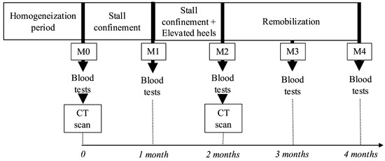 At the start of the study (M0), the horses were confined to stalls for a period of 2 months (M0 to M2) (