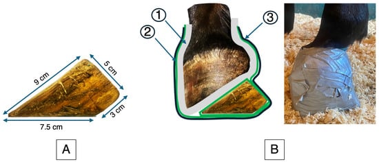 Figure 2) and secured with a hoof bandage. The wedge was checked daily for proper fitting and replaced twice a week. At each change, the veterinarian carefully examined the skin and assessed for signs of pain. Stall confinement was then followed by two months of remobilization (M2 to M4), during which the horses were returned to pasture.