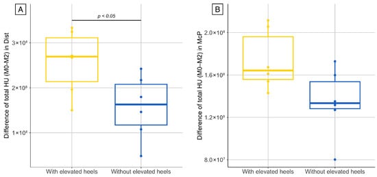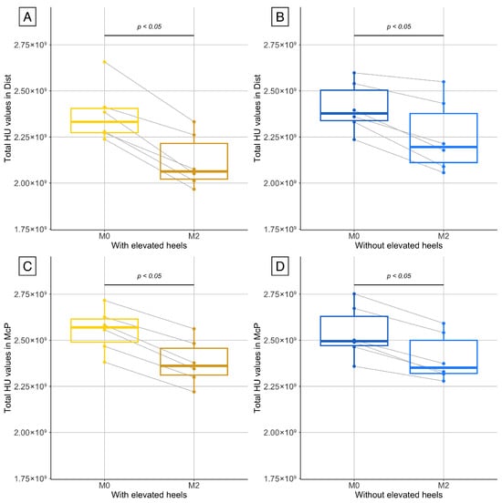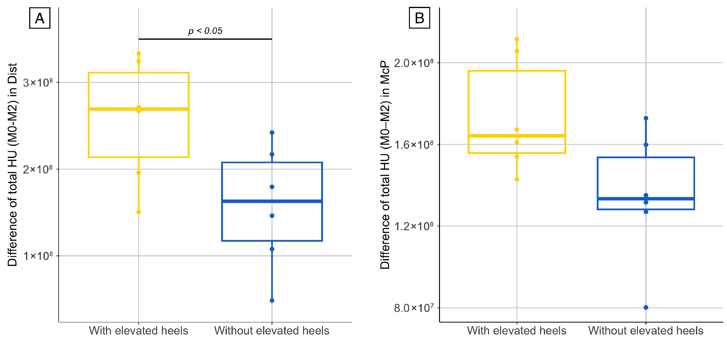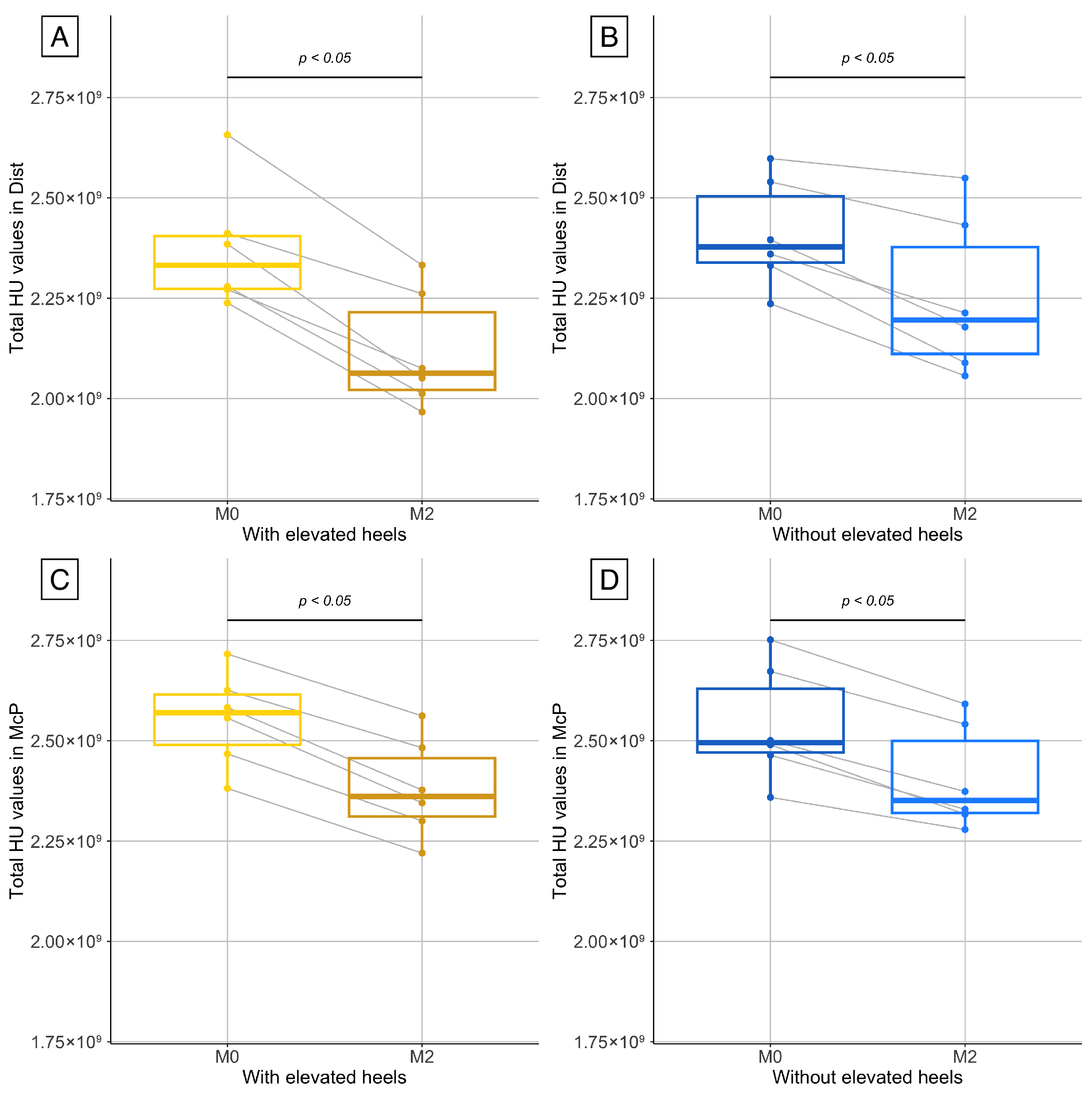 Two sets of comparisons were performed to assess changes in bone density. First, for each limb (with and without elevated heels) and for each series (McP and Dist), total HU values at M0 and M2 were compared to evaluate temporal changes. Second, for each series, the intraindividual differences in HU values between M0 and M2 were calculated and compared between the limbs to assess the effect of heel elevation. The normality of the data was assessed using the Shapiro–Wilk test. Due to the small sample size, a paired Wilcoxon signed rank test was used for all comparisons.
