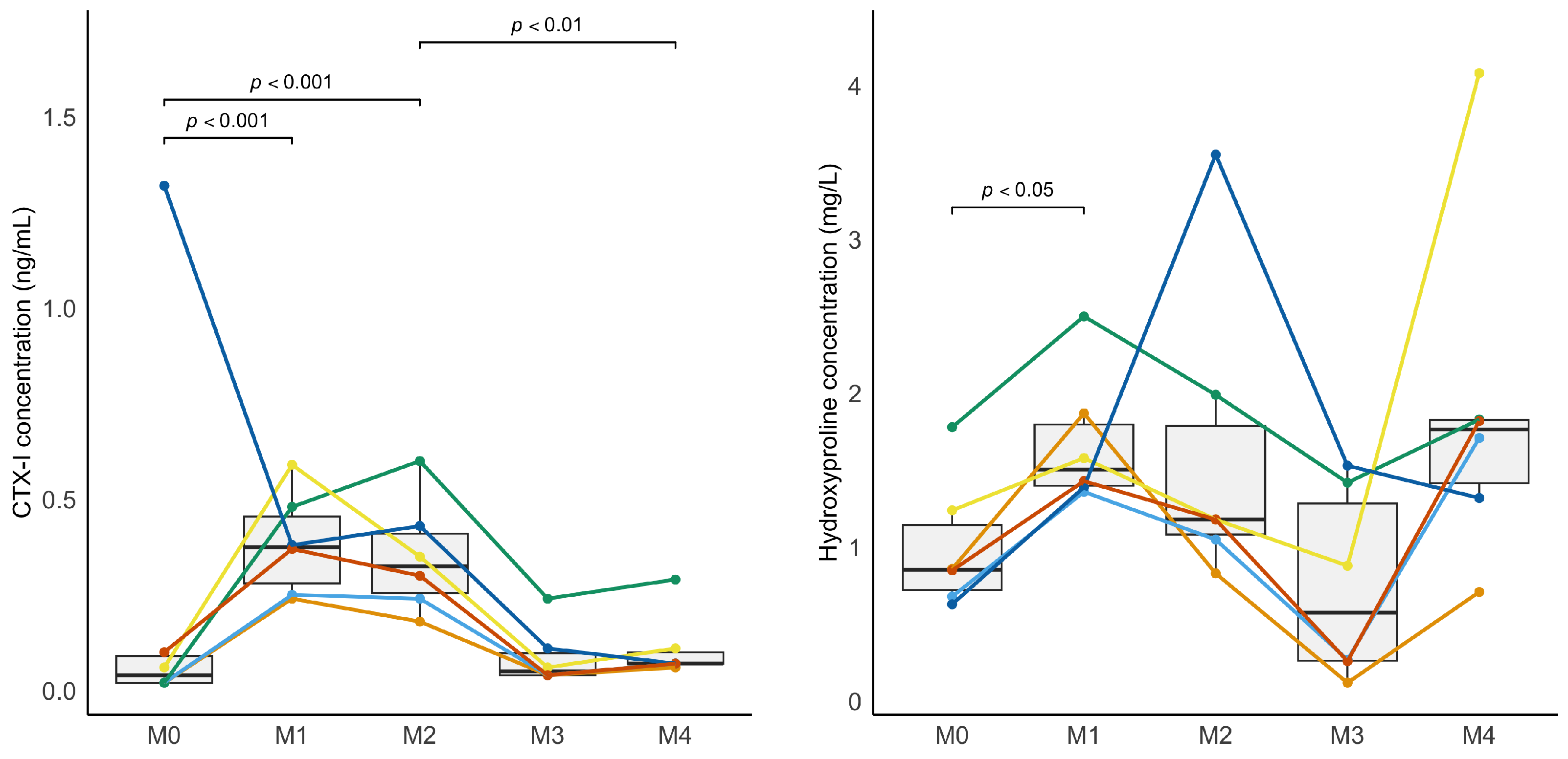 In our study, CTX-I serum concentrations increased during confinement and decreased during the remobilization period, closely paralleling the expected resorption pattern. One horse exhibited an isolated high baseline CTX-I value. No specific explanation was found, as all other markers for this horse remained consistent with the group. However, this did not alter the statistical significance of the changes observed over time. Similarly, although hydroxyproline has not been widely used in previous studies, it was also affected in this study at the beginning of the immobilization period (M0 vs. M1). Serum osteocalcin concentration was not significantly affected by the physical activity level in our study, which contrasts with previous studies [