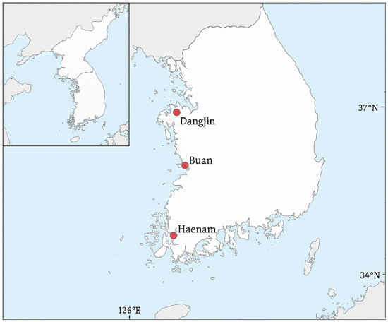 Study sites of passive acoustic monitoring in South Korea. The three sites (Dangjin, Buan, and Haenam) in red were all rice paddies. The sites are distributed along the west and south coasts, spanning approximately one degree of latitude. Base map data: Natural Earth (public domain).