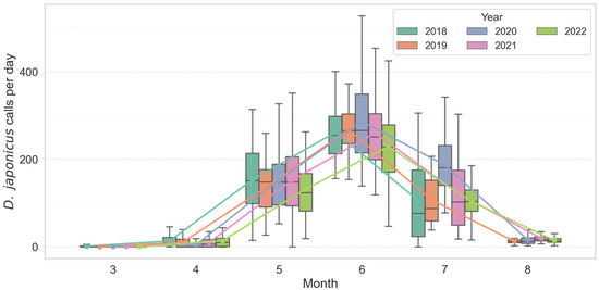 Seasonal and inter-annual variation in monthly calling activity of D. japonicus across multiple breeding seasons (2018–2022). Colored boxes show interquartile ranges (25th–75th percentiles), horizontal lines inside boxes denote medians, and whiskers represent 1.5 × IQR. Colored lines indicate per-year monthly mean trends, highlighting the consistent June peak and abrupt seasonal onset in D. japonicus.