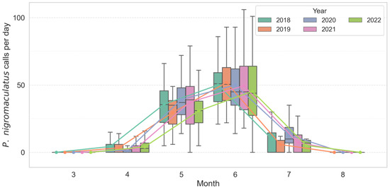 Analysis of monthly call count distributions revealed strong seasonal and interannual variation in both D. japonicus and P. nigromaculatus. D. japonicus exhibited a sharp increase in activity from late May, with a pronounced peak consistently observed in June across all years (Figure 2). In June, the species produced a mean of 271.8 ± 68.2 calls/day (median = 262.5, range = 145–535, n = 450 recorder-days). Annual means ranged from 229.2 ± 85.8 in 2022 to 290.2 ± 88.7 in 2020, but median values exceeded 200 calls/day in every year, confirming synchronous breeding choruses. Statistical comparisons confirmed that June activity was significantly higher than in May and July (Kruskal–Wallis χ2 = 510.71, df = 2, p < 0.001; post hoc Mann–Whitney with Bonferroni correction, p < 0.01). In contrast, P. nigromaculatus showed an earlier seasonal onset, with calling activity emerging in April–May, reaching its highest levels in June, and tapering off by mid-July (Figure 3). In June, this species produced a mean of 52.7 ± 17.3 calls/day (median = 51.0, range = 21–136, n = 450). Annual means varied from 45.3 ± 25.3 in 2022 to 56.4 ± 20.7 in 2019. Seasonal differences were significant (Kruskal–Wallis χ2 = 817.76, df = 2, p < 0.001), with all pairwise comparisons between months also significant (p < 0.001).