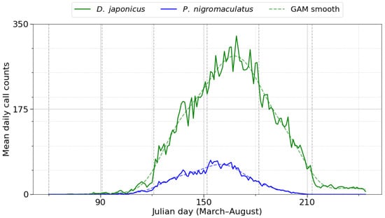 Generalized additive modeling (GAM) of daily call counts characterized within-season dynamics for the two focal species (Figure 4). D. japonicus reached its maximum on Julian day 169 (June 18), with mean daily calling activity of 325 calls. Activity increased from late May and declined after mid-July. The spread of activity in the raw data was SD = 23.8 days and IQR = 30 days. P. nigromaculatus reached its maximum earlier, on Julian day 154 (June 3), with a mean of 70 calls per day. Its activity started in late April, remained elevated through early to mid-June, and decreased toward mid-summer (SD = 18.7 days, IQR = 26 days). Model fits explained 34% of deviance for D. japonicus and 19% for P. nigromaculatus (both p < 0.001), indicating that D. japonicus exhibited a more synchronized and predictable seasonal peak, whereas P. nigromaculatus showed a broader, less sharply synchronized seasonal pattern.
