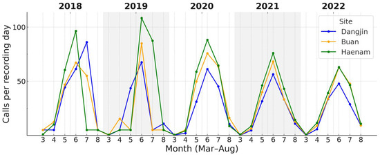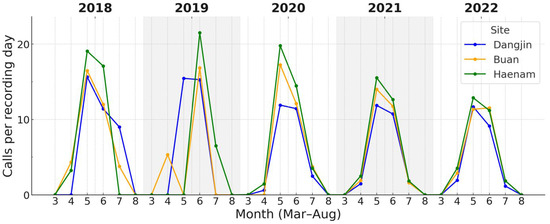 Monthly calling rates (calls per recording-day) of D. japonicus across three sites (Dangjin, Buan, Haenam) during 2018–2022. Colored lines show site-specific monthly medians within the breeding season of each year. The figure illustrates regional variation in calling rates, with generally higher values at Haenam, intermediate at Buan, and lower at Dangjin. Detailed seasonal timing based on cumulative-activity thresholds is provided in Table 3.