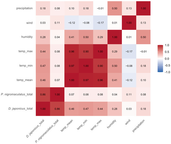 Spearman correlation matrix between daily calling activity of D. japonicus and P. nigromaculatus and local weather variables (mean, minimum, and maximum daily temperature, humidity, wind speed and precipitation). The analysis was conducted using nonzero daily call counts across all sites and years. Calling activity of D. japonicus was positively associated with temperature and humidity, while P. nigromaculatus showed weak or negligible correlations with all tested weather variables.