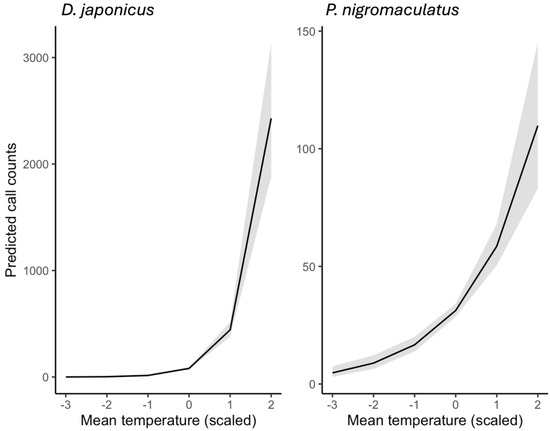 Our modeling analyses revealed clear interspecific contrasts in responses to weather drivers. While both species increased calling activity with rising temperature, D. japonicus exhibited much higher predicted call outputs under warm conditions, whereas P. nigromaculatus peaked at substantially lower levels. These differences likely reflect a combination of physiological and behavioral strategies, as well as ecological contexts such as male–male competition and habitat acoustics, which can influence total call output.