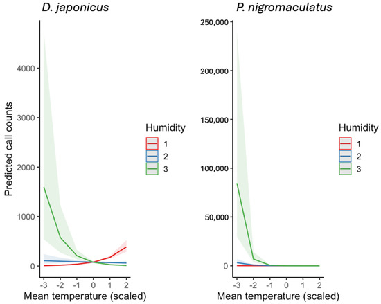 Beyond main effects, a pronounced interaction between temperature and humidity was detected (Figure 9). For visualization, daily mean relative humidity was divided into three representative levels of the observed distribution: low (−1 SD, Humidity 1), average (Humidity 2), and high (+1 SD, Humidity 3). In D. japonicus, the stimulatory effect of temperature on calling activity was clearly reduced under high humidity, with predicted call counts plateauing even under warm conditions. In P. nigromaculatus, this suppression was even stronger: high humidity substantially dampened calling activity at elevated temperatures, reducing predicted counts to near baseline levels.