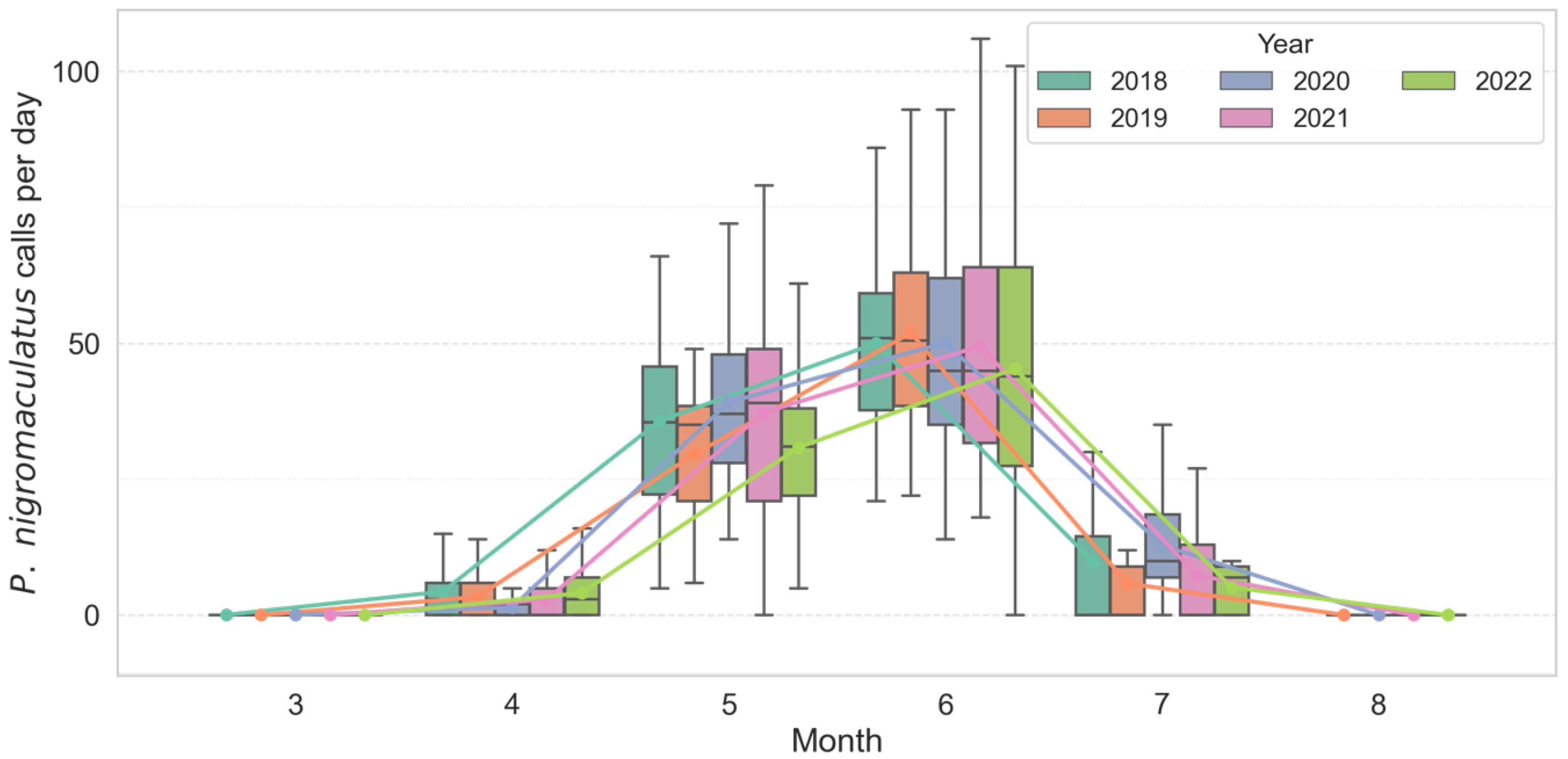 Figure 3. Seasonal and inter-annual variation in monthly calling activity of P. nigromaculatus across multiple breeding seasons (2018–2022). Colored boxes show interquartile ranges (25th–75th percentiles), horizontal lines inside boxes denote medians, and whiskers represent 1.5 × IQR. Colored lines indicate per-year monthly mean trends, illustrating the gradual early-season increase (April–May) and earlier onset pattern relative to D. japonicus.