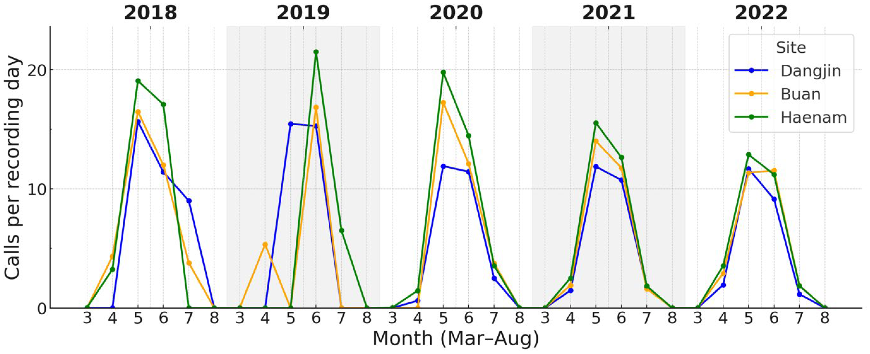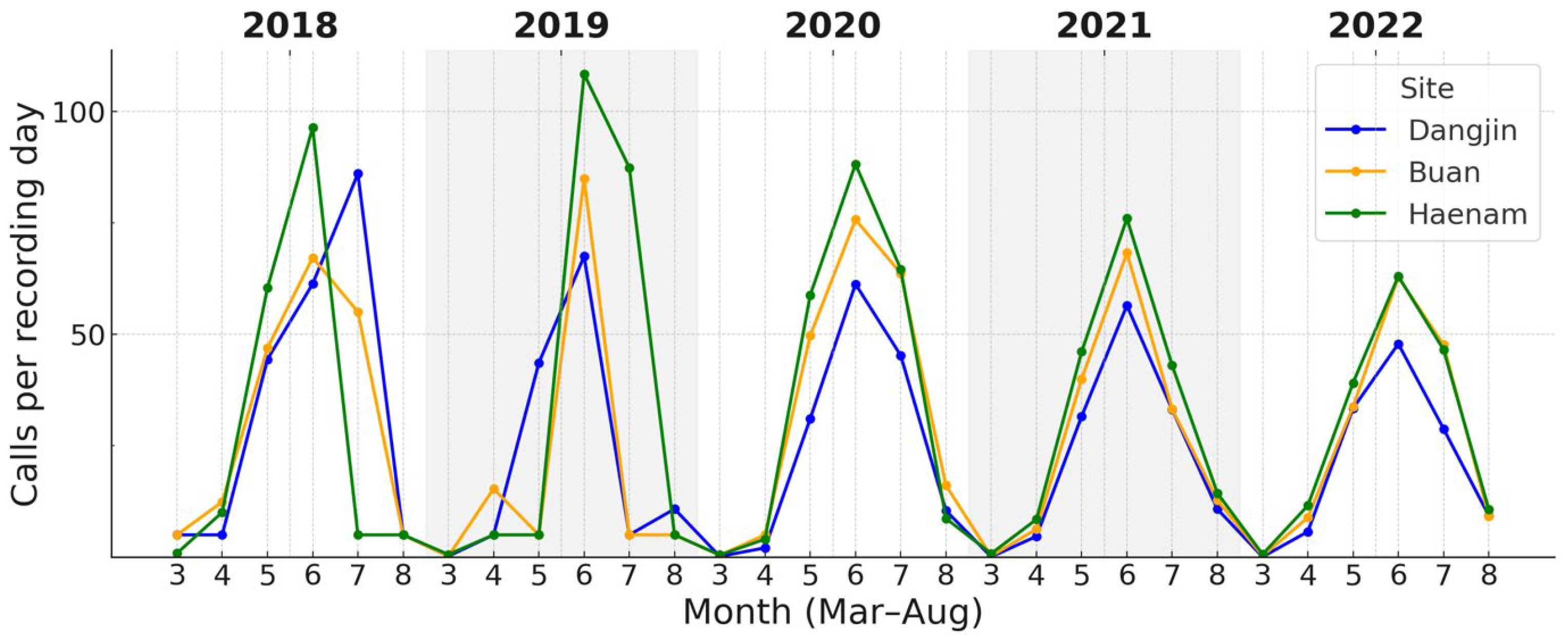 Figure 6. Monthly calling rates of P. nigromaculatus across the three sites (2018–2022). Onset occurred earlier (April–May) and peaks were broader than in D. japonicus. Haenam frequently (in 2019, 2021, and 2022) attained the highest rates, Dangjin the lowest, with Buan intermediate.
