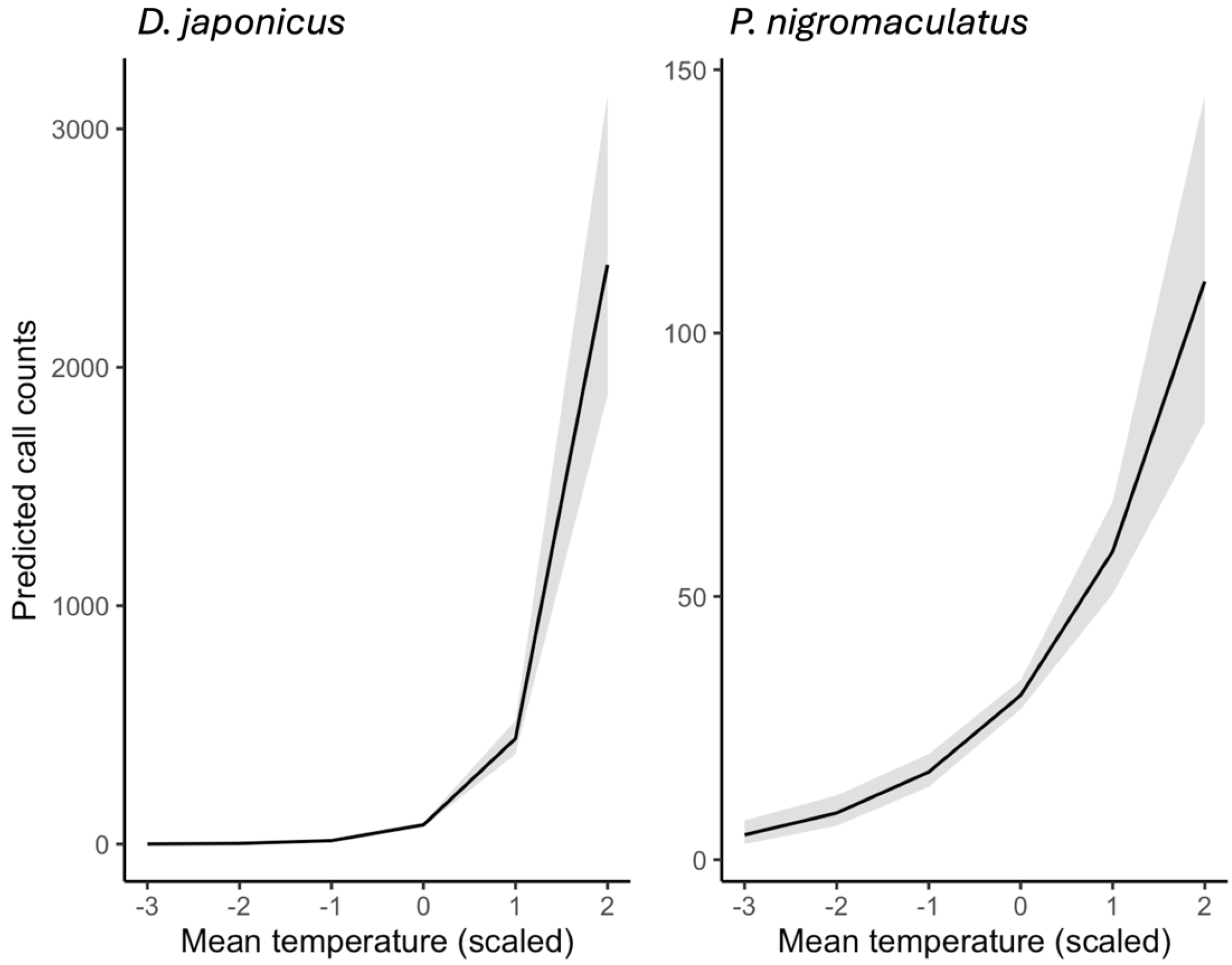 Figure 8. Predicted effects of mean daily temperature on the calling activity of D. japonicus and P. nigromaculatus, based on zero-inflated negative binomial (ZINB) GLMMs. Temperature values are standardized (z-scores), with 0 corresponding to the mean observed temperature across all recordings (2018–2022). Solid lines show model predictions, and shaded bands represent 95% confidence intervals.