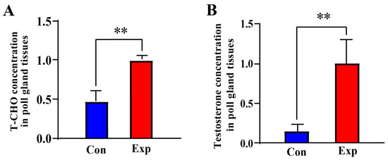 T-CHO and testosterone concentrations detected in camel PGs. (A) T-CHO content; (B) testosterone content Con, control group; Exp, experimental group. ** p < 0.01.