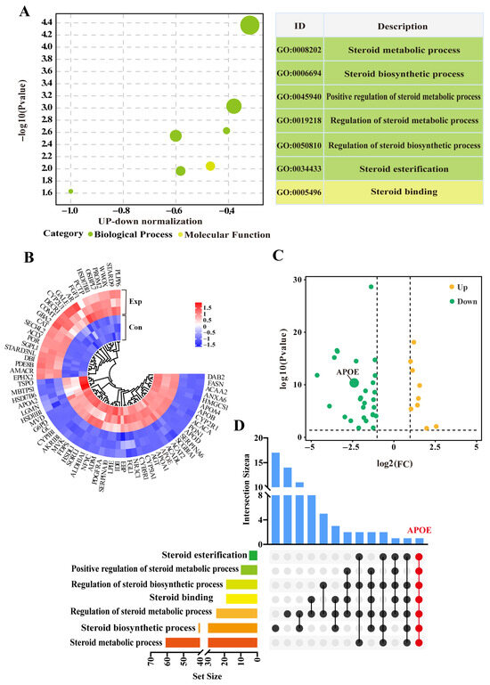 Seven GO terms, including six biological process terms and one molecular function term, were screened from the DIA data (Supplementary Table S2). These GO terms were mainly related to steroid metabolism, biosynthesis, and regulation, particularly steroid esterification (Figure 3A). After removing duplicate DEPs, a total of 69 DEPs (31 downregulated and 12 upregulated) were identified within the GO terms (Figure 3B). The heatmap showed relatively consistent expression of these DEPs in three replicates of the control group, whereas their expression patterns differed significantly between control and experimental groups (Figure 2C). The UpSet Venn diagram demonstrated that APOE, a unique DEP, was shared among these GO terms (Figure 2D). These results highlight these 69 DEPs, and especially APOE, as playing important roles in steroid synthesis and transport in camel PGs, during the breeding season.