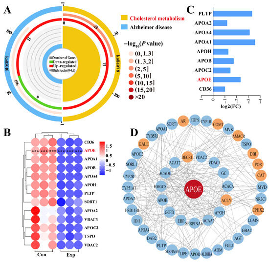 Identification of pathways and DEPs interacting with APOE and enrichment analysis. (A) Enrichment analysis identifying two pathways associated with APOE. (B) Relative expression levels of DEPs quantified by DIA proteomics. (C) Heatmap of 13 DEPs in the cholesterol metabolism pathway. (D) Protein–protein interaction network of DEPs identified from GO terms and pathways enrichment analysis. Con, control group; Exp, experimental group. *** represents p < 0.001.
