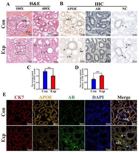 Distribution, expression patterns, and co-localization analysis of APOE and AR in camel PGs. (A) Histological observation of PGs performed using H&E staining. (B) APOE and AR protein distribution assessed via immunohistochemical (IHC) analysis. (C,D) Optical density of APOE and AR proteins, respectively, quantified from the IHC staining results. (E) Immunofluorescence staining results of poll glands for anti-APOE, AR, and CK7 proteins. Abbreviations: A, alveolar; C, catheter; DM, dermal muscles; PGL, poll gland lumen; Se, secreta; CT, connective tissues; CL, catheter lumen; AEC, alveolar epithelial cell; CEC, catheter epithelial cell. Con, control group; Exp, experimental group. ** p < 0.01.