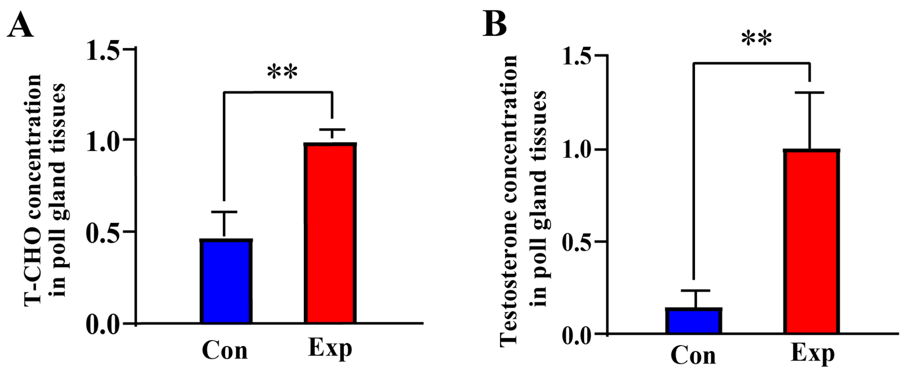 3.1. T-CHO and Testosterone Concentrations in Camel PGs During the Breeding Seasons