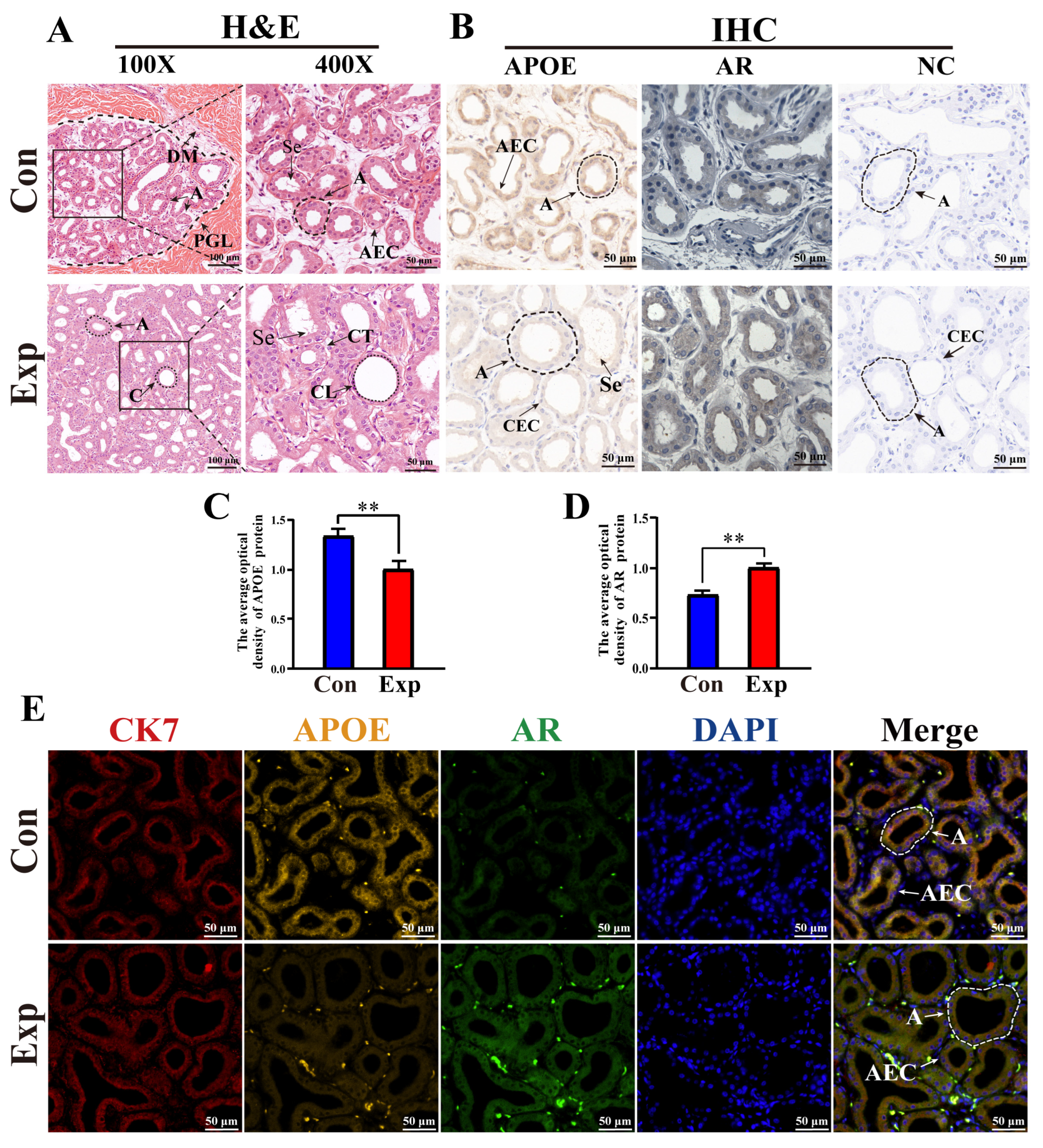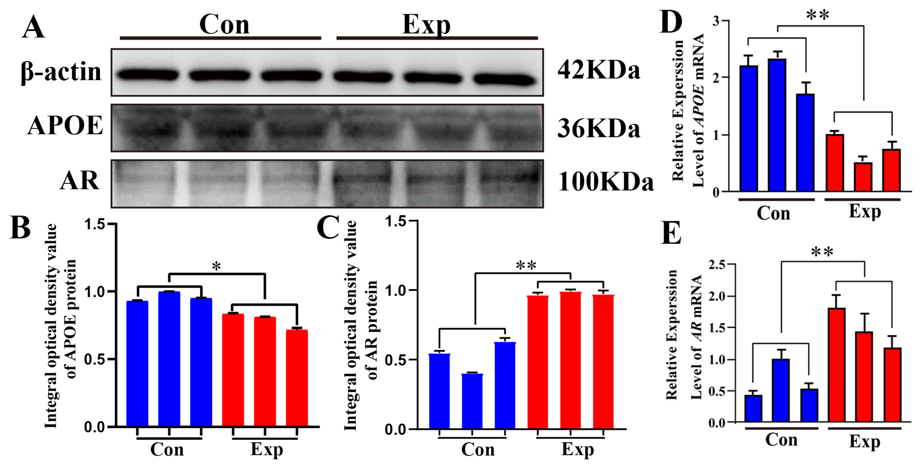 3.6. Relative Protein and mRNA Expression Levels of APOE and AR in Camel PGs