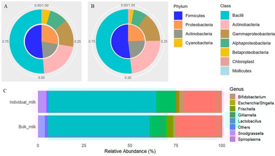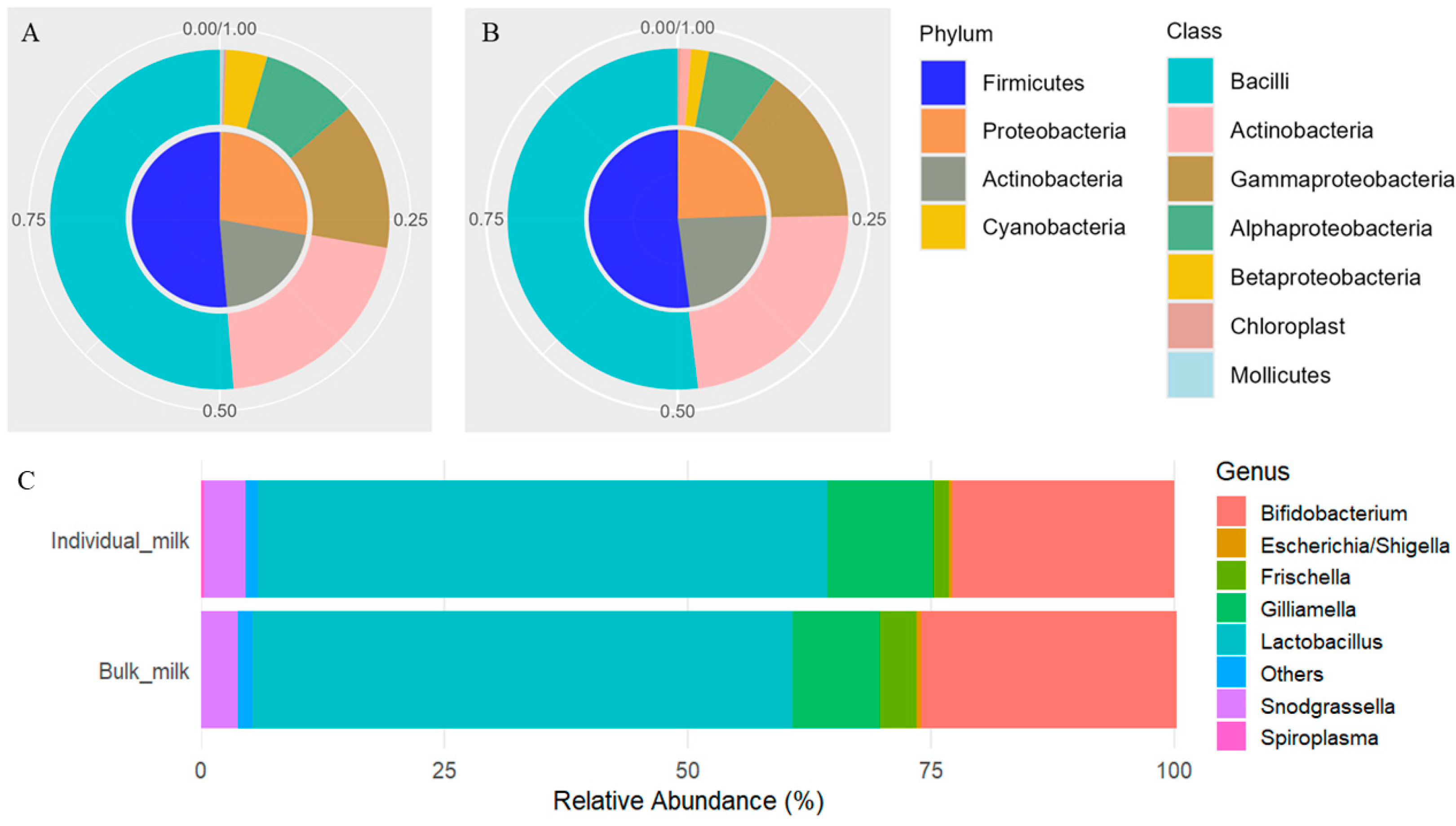 Microbial composition of individual (A) and bulk (B) goat milk samples at the phylum (inner ring) and class (outer ring) taxonomic levels. Each pie chart displays the relative abundances of the most prevalent taxa. (C) Stacked bar plots of the relative abundances of the dominant bacterial genera in individual and bulk milk samples.