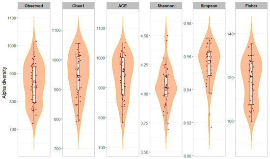 Alpha diversity of the milk microbiota across 44 individual samples. Each panel represents one of six diversity indices (Observed, Chao1, ACE, Shannon, Simpson, and Fisher). Violin plots show the distribution of values for each index, boxplots indicate the median and interquartile range, and jittered points represent individual samples. The figure highlights inter-individual variability in microbial diversity across samples.