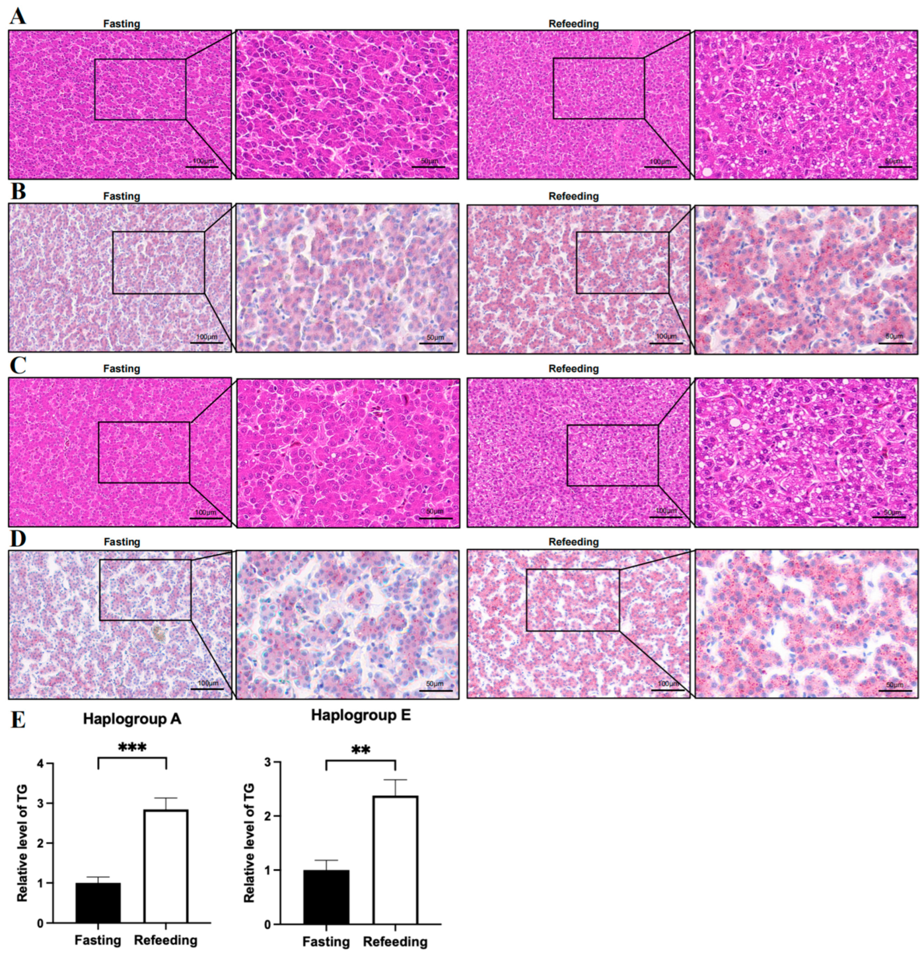 The findings from this study have some implications for animal production. Firstly, we found that feeding promoted fat deposition in the liver of chicken; thus, overfeeding may lead to obesity and obesity-associated diseases such as non-alcoholic fatty liver disease. In practice, the feed formula and intake should match the actual nutritional needs of animals to avoid excessive nutrient or energy intake. Secondly, we found that during fasting, the oxidative phosphorylation level in the cell was low, which could lead to insufficient energy required for their life activities, affecting their growth and production performance. Therefore, when animals are transported over long distances and suffer from nutritional deficiencies, it is better to provide them with energy in advance and replenish food promptly upon arrival at their destination. Thirdly, we found that the number of clustered ribosomes in cells increased during feeding, which reflects that feeding promotes protein synthesis in cells and animal growth. Therefore, in practice, the protein level and composition of the diet should be reasonable and balanced, which will be beneficial for the growth and development of animals. Fourthly, we found that compared to the A haplogroup, the E haplogroup was more prone to oxidative stress during feeding. This suggests that in practice, different amounts of antioxidants should be supplemented according to the mitochondrial haplogroups among different breeds of animals. For example, the breeds with E haplogroup should add more antioxidants than the breeds with A haplogroup. Lastly, we found that adding glucose was beneficial to mitochondrial biogenesis of A haplogroup, while adding oleic acid did not induce oxidative stress in E haplogroup. This suggests that in practice, breeds with A haplogroup are more suitable for carbohydrate-based dietary formula, while adding oleic acid appropriately is more beneficial to the breeds with E haplogroup.