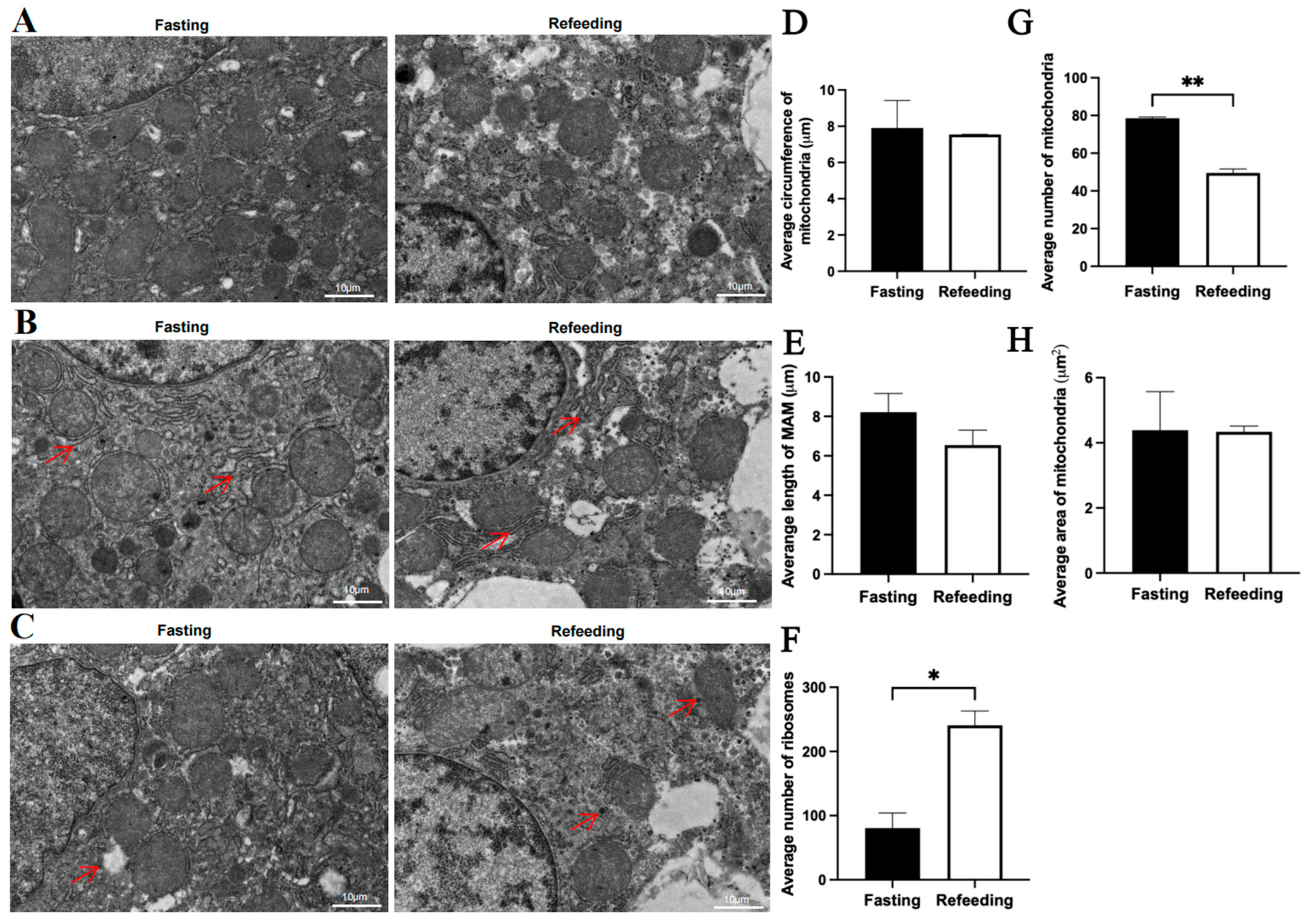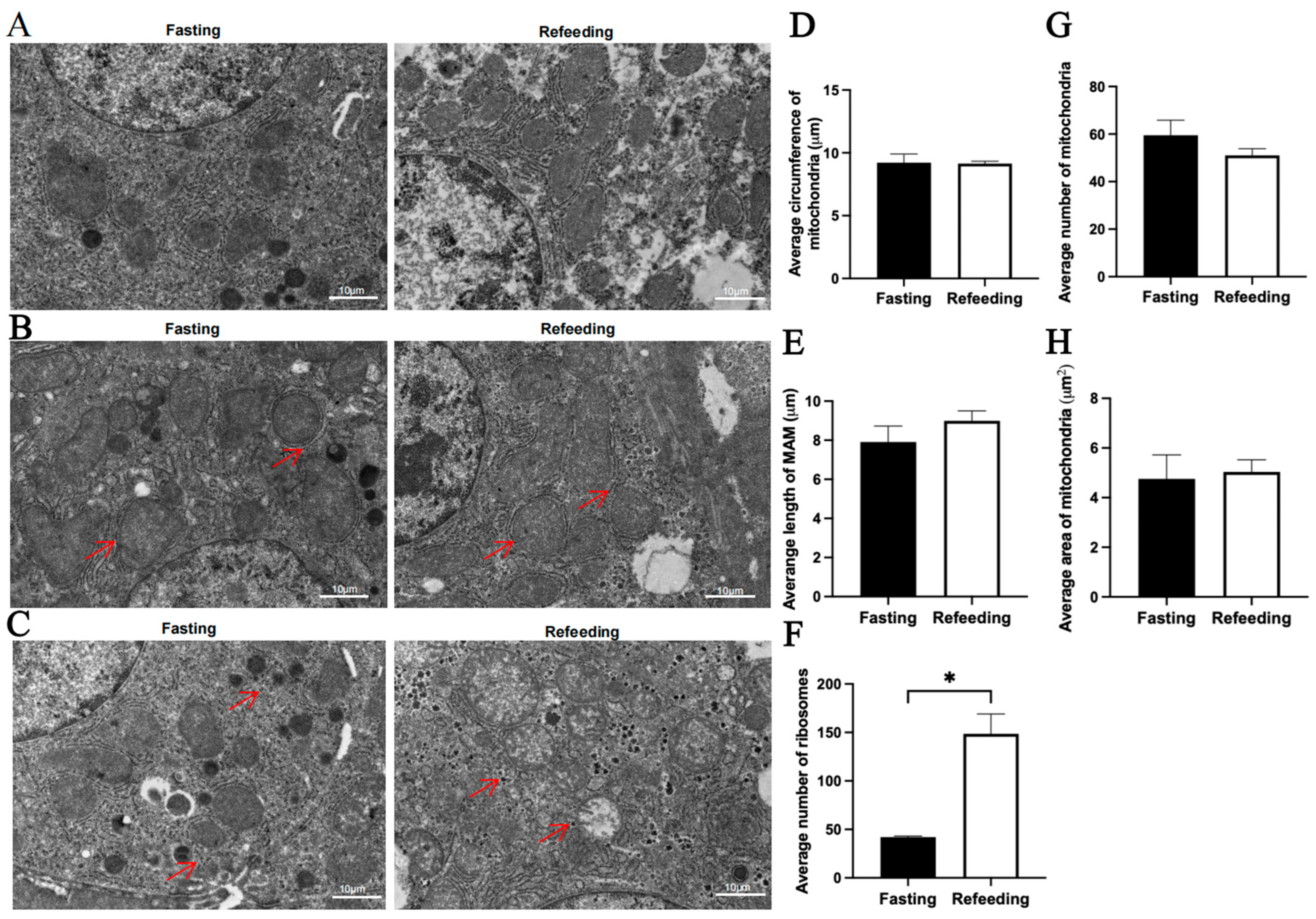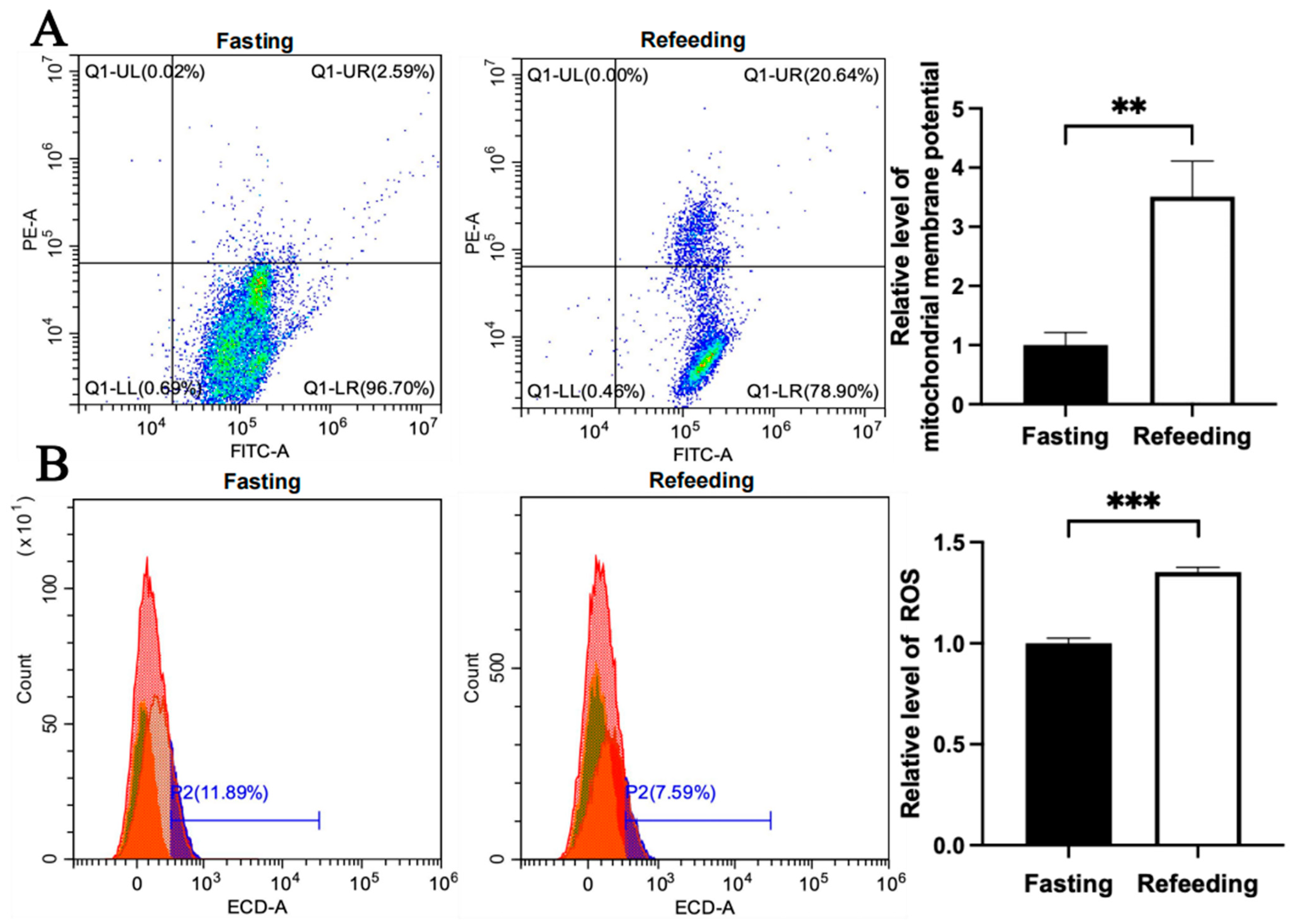 7]. Cells have pathways to remove damaged mitochondria, such as mitochondrial autophagy, so elevated ROS level may lead to a reduction in the number of mitochondria. Indeed, the number of mitochondria in the E group hepatocytes was significantly reduced in the refeeding state relative to the fasting state, and this reduction may be related to the increased mitochondrial damage induced by elevated ROS level. Consistent with this, neither ROS level nor the number of mitochondria in the A group hepatocytes changed significantly during the refeeding state relative to the fasting state.