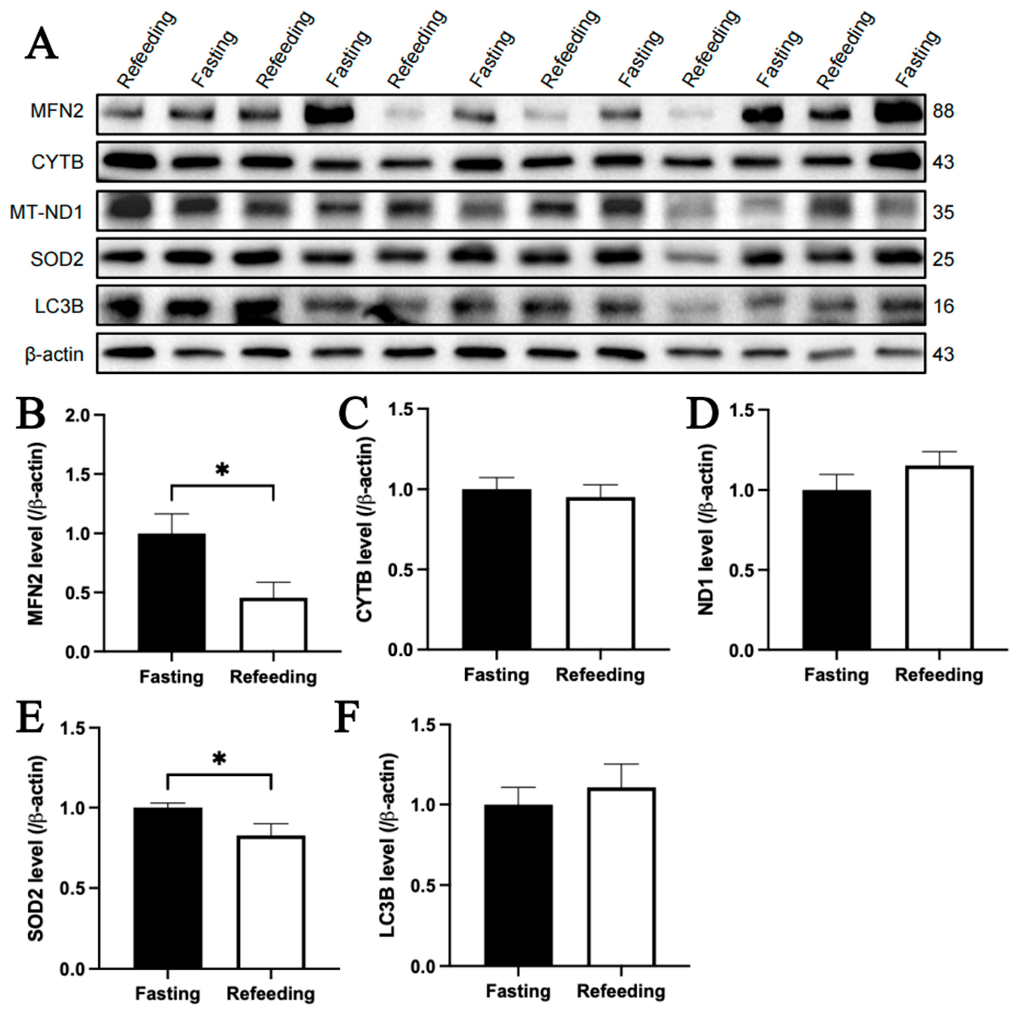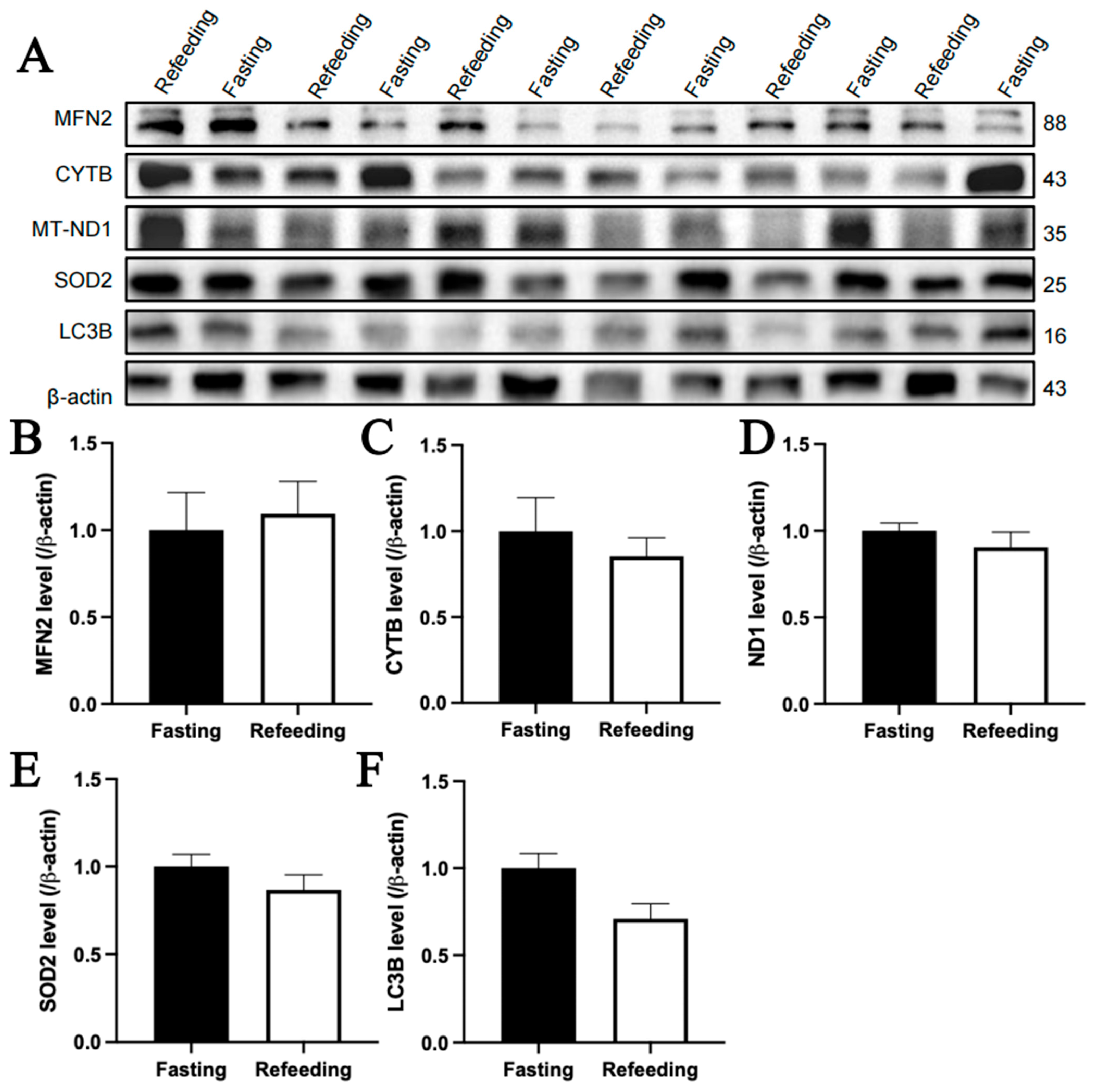 As for the significantly lower protein contents of MFN2 and SOD2 in hepatocytes with the A mitochondrial haplogroup in the refeeding state than in the fasting state, this may be related to the activation of the AMPK signaling pathway during fasting. Previous studies have reported that when the cellular energy level is low such as in the fasting state, the activation of AMPK can promote the fusion of mitochondria and the activation of KEAP1/NRF2 signaling pathway [