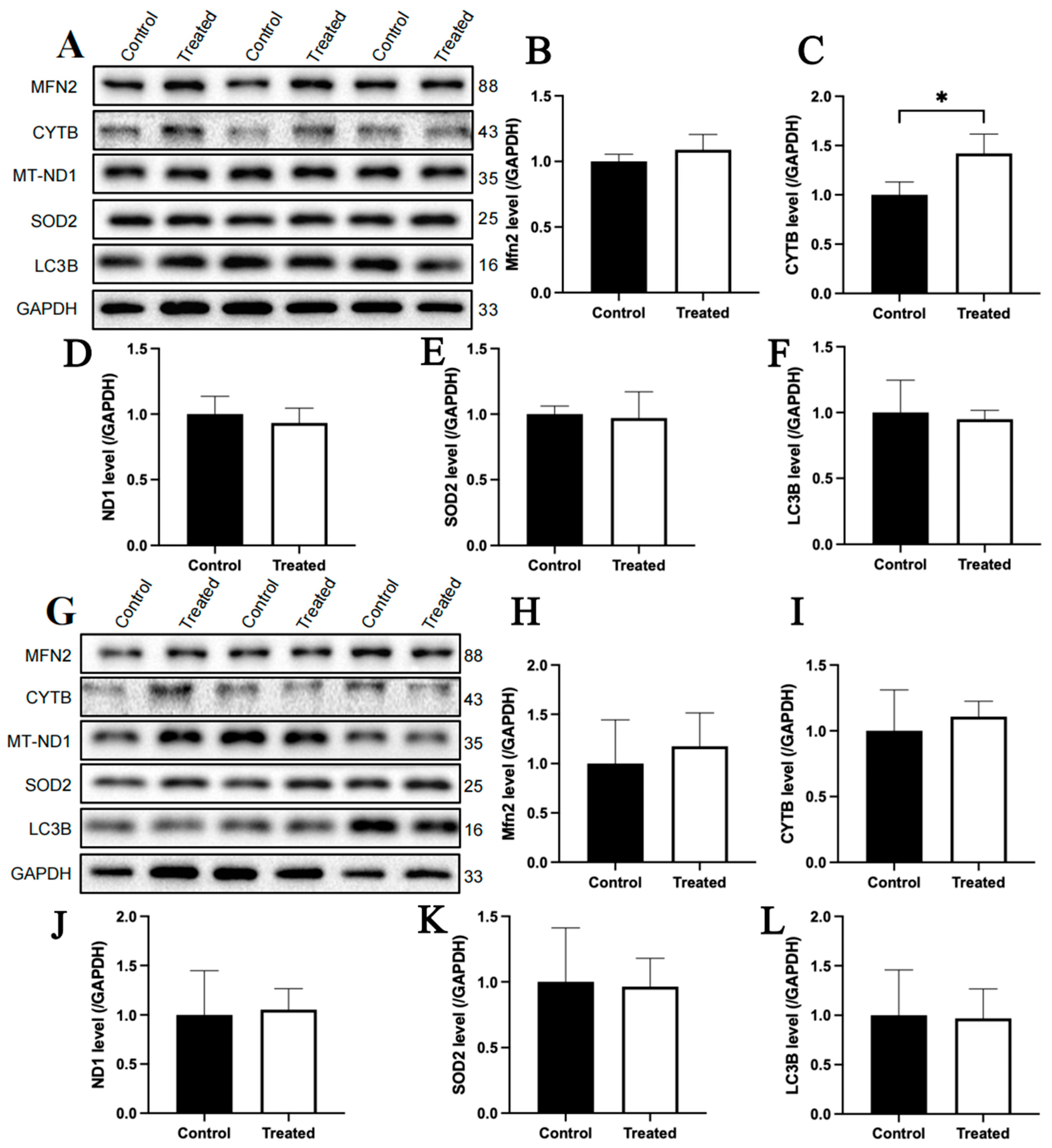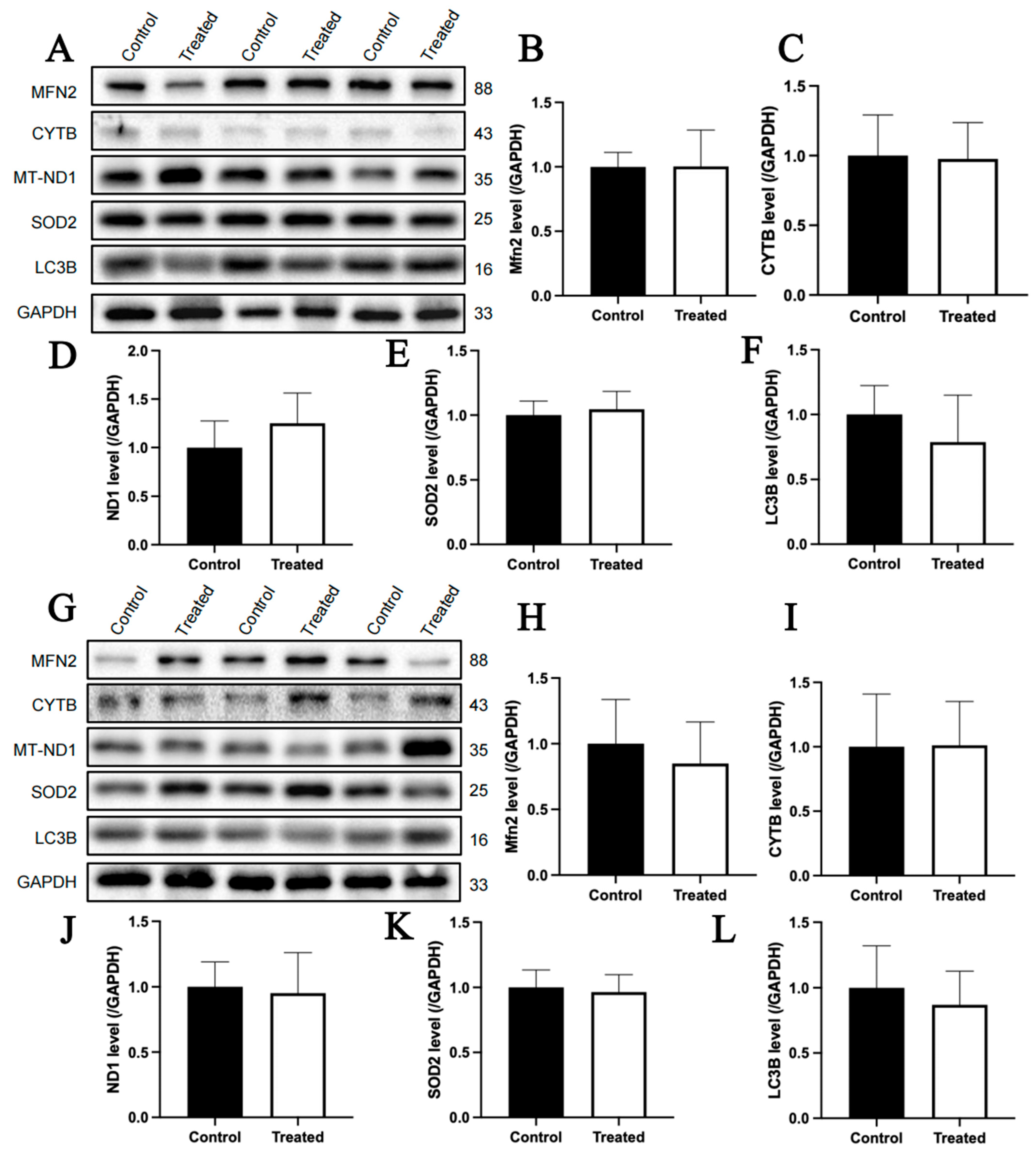 16], the protein samples were then subjected to electrophoresis on SDS-PAGE (Beyotime, Shanghai, China), followed by transferring the separated proteins to 0.45 μm polyvinylidene difluoride (PVDF) membrane (Merck Millipore, Burlington, MA, USA). Subsequently, the membrane was blocked with NcmBlot blocking buffer (NCM Biotech, Suzhou, China) for 20 min, incubated with primary antibody (1:1000) at 4 °C overnight, and in turn incubated with secondary antibody (1:10,000). At last, the membrane was developed with the Chemiluminescence Kit (Vazyme, Nanjing, China) and imaged using fully automatic chemiluminescence/fluorescence image analysis system (Tanon, Shanghai, China). GoldBand 3-color prestaining protein marker (20351ES, Yeasen, Shanghai, China) was used to indicate protein molecular weight. The primary antibodies used in this study include MFN2 (sc-100560, Santa Cruz Biotechnology, Dallas, TX, USA), β-actin (AC026, ABclonal, Wuhan, China), GAPDH (10494-1-AP, Proteintech, Wuhan, China), SOD2 (24127-1-AP, Proteintech, Wuhan, China), LC3B (3868T, Cell Signaling Technology, Danvers, MA, USA), MT-ND1 (YA2089, MedChemExpress, Monmouth Junction, NJ, USA), CYTB (55090-1-AP, Proteintech, Wuhan, China). The secondary antibodies used in this study include Goat Anti-Rabbit IgG (CW0103S, Cwbiotech, Taizhou, China) and Goat Anti-Mouse IgG (CW01025, Cwbiotech, Taizhou, China).