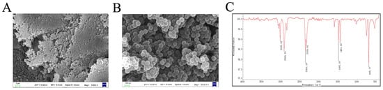Morphological and chemical characterization of NPs. (A) Representative scanning electron microscopy (SEM) image of NPs at a 1 μm scale. (B) High-magnification SEM image showing detailed NP morphology at a 0.1 μm scale. (C) Fourier-transform infrared (FTIR) spectrum of NPs showing characteristic absorption bands.
