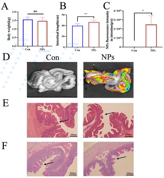 To assess the impacts of NPs on intestinal health, body weight, intestinal length, fluorescence imaging, and histopathological features were evaluated. No significant differences in body weight were observed between the Con and NPs groups (p = 0.3343; Figure 2A). However, significant alterations in intestinal length were detected in the NPs group compared to the Con group (p = 0.0009; Figure 2B). Fluorescence imaging showed markedly greater accumulation of NPs in the intestinal tissues of chickens administered NPs compared to the Con group (p = 0.0110; Figure 2C,D). Histopathological examination revealed structural abnormalities, including sparse microvilli, villus shortening, disruption of epithelial tight junctions (Figure 2E), and a reduction in goblet cell density compared to the Con group (Figure 2F). These results demonstrate that NPs exposure can adversely affect intestinal integrity and healthy development in chickens.