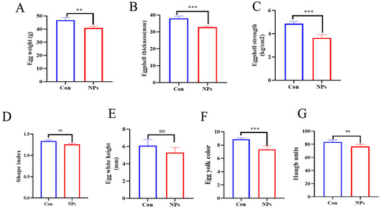 Effects of NPs exposure on egg quality parameters between groups Con and NPs. (A) Egg weight, (B) eggshell thickness, (C) eggshell strength, (D) egg shape index, (E) egg white height, (F) egg yolk color, (G) Haugh units. Data are presented as mean ± standard deviation (SD) (n = 6 per group). Statistical significance was determined using Student’s t-test and is indicated as follows: ns = not significant; ** p < 0.01, *** p < 0.001.