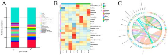 Compositional profiling analysis of cecal microbial differences between the Con and NPs groups. (A) Relative abundance of the top 20 bacterial genera. (B) Heatmap of the top 20 abundant phyla in cecal microbiota. (C) Circos plot of sample-species associations (top 20 taxa; line width proportional to abundance).