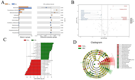 To investigate the effects of NPs exposure on the cecal microbial community, we employed a t-test algorithm to identify the microbial species that showed significant differences between the Con and NPs groups, and these species could serve as biomarkers. Differential abundance analysis identified 17 significant microbial biomarkers distinguishing the Con and NPs groups (p < 0.05, Figure 6A). These findings were validated through volcano plot analysis, which confirmed substantial alterations in microbial abundance profiles (Figure 6B). The following taxa were significantly upregulated: Prevotellaceae_UCG-001, Methanobrevibacter, Enterorhabdus, Collinsella and Bifidobacterium. Downregulated taxa included Bacteroides, Oscillibacter, Candidatus_Vestibaculum, Butyricicoccus, Erysipelatoclostridium, Parasutterella, Family_XIII_UCG-001, Faecalitalea, [Ruminococcus]_gauvreauii_group, Papillibacter, and Ruminococcus. Meanwhile, we also used LEfSe analysis to comprehensively identify differential taxa associated with NPs exposure (Figure 6C,D, LDA score > 2, p < 0.05). The LDA bar plot highlighted that the Con was dominated by the following groups: Coriobacteriaceae_UCG_002, Erysipelatoclostridium, Bifidobacterium, Lachnoclostridium, Slackiaceae, Enterorhabdus, Collinisella, Olserjella, Enorma, Methanobrevibacter, and Prevotellaceae_UCG_001. The NPs group was enriched in Barnesiella, Oscillibacter, Butyricicoccus, Sutterella, Parasutterella, Papillibacter, Family_XIII_UCG_001, [Ruminococcus]_gauvreauii_group, Faecalitalea, and Ruminococcus. These findings at the species level consistently identified specific microbial taxa altered by NPs exposure, providing reliable biomarkers for elucidating the mechanisms underlying gut health impairment.