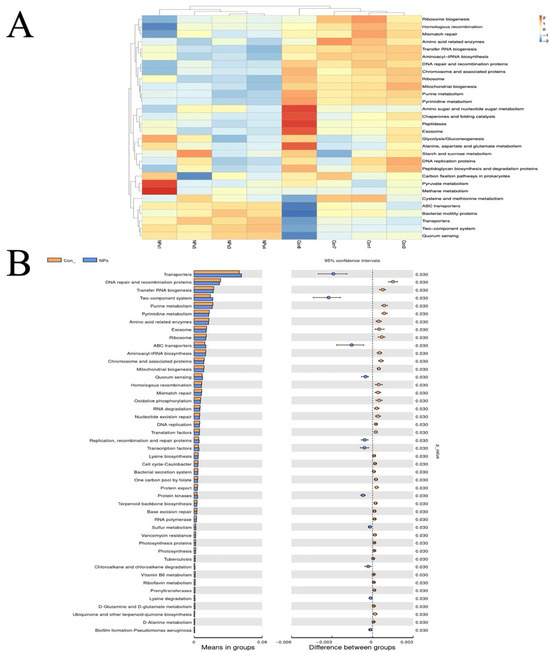 To predict functional impacts of cecal microbiota on the Con and NPs groups, we used Tax4Fun-based functional annotation on the KEGG database. This identified 5927 KEGG orthologs (KOs) corresponding to 377 pathways. Pathway enrichment analysis revealed that microbiota-associated functions were predominantly metabolic (primary level), followed by genetic information processing, environmental information processing, cellular processes, human diseases, and organismal systems. Dominant secondary classifications included carbohydrate metabolism, replication and repair, translation, membrane transport, and amino acid metabolism. The top 30 most abundant level 3 pathways were selected for heatmap visualization, clustered by functional category (Figure 7A). Comparative analysis identified significantly enriched pathways (p < 0.05) in transporters, DNA repair/recombination proteins, tRNA biogenesis, two-component systems, pyrimidine metabolism, amino acid-related enzymes, exosome, ribosome, and ABC transporters (Figure 7B).