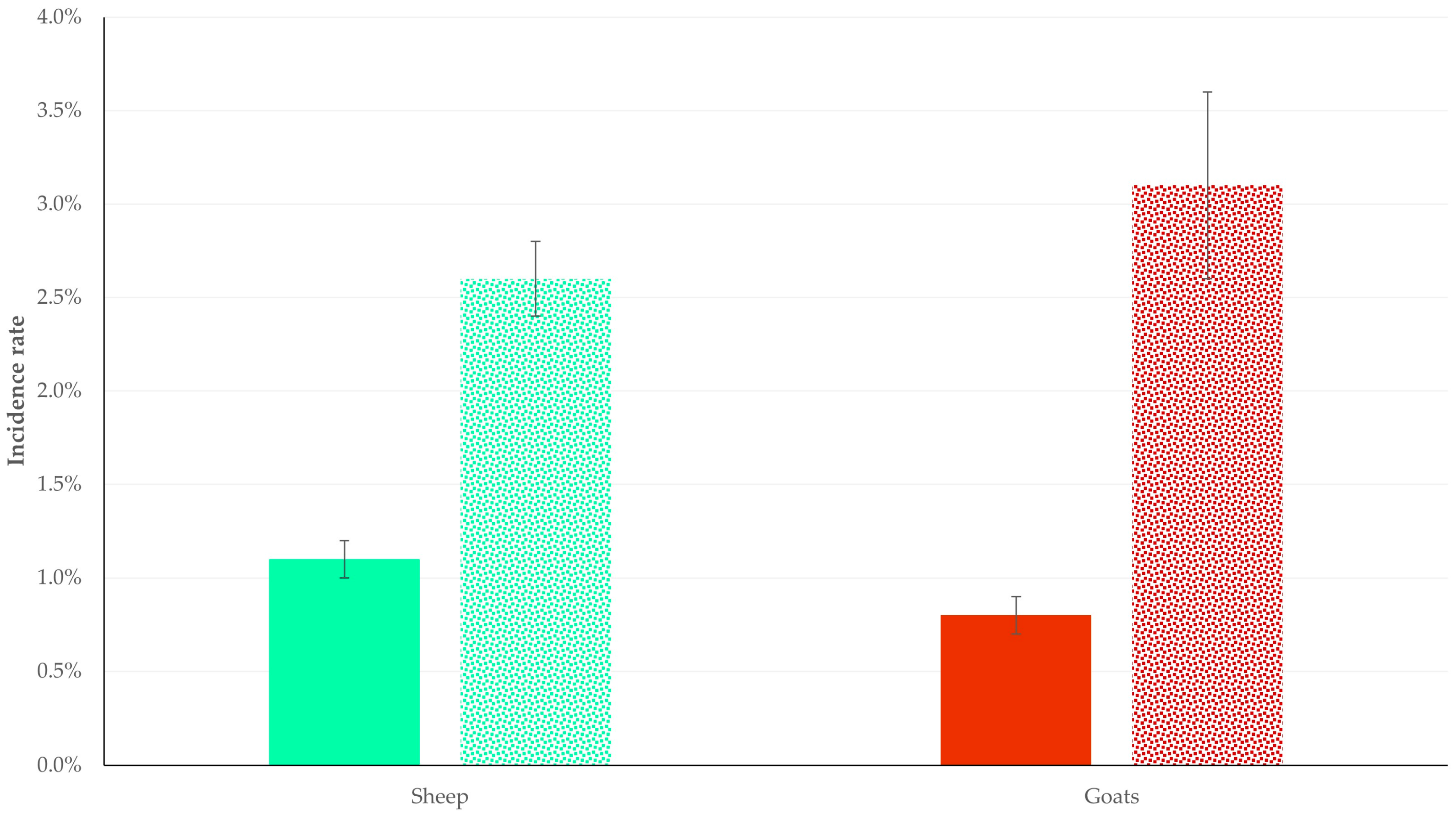 | Goat farms (n = 119) | median 0.0% (IQR: 0.0%) mean 1.6% (s.e.: 0.8%) range: 0.0–26.7% | median 0.0% (IQR: 0.0%) mean 0.8% (s.e.: 0.2%) range: 0.0–12.5% | 0.63 |