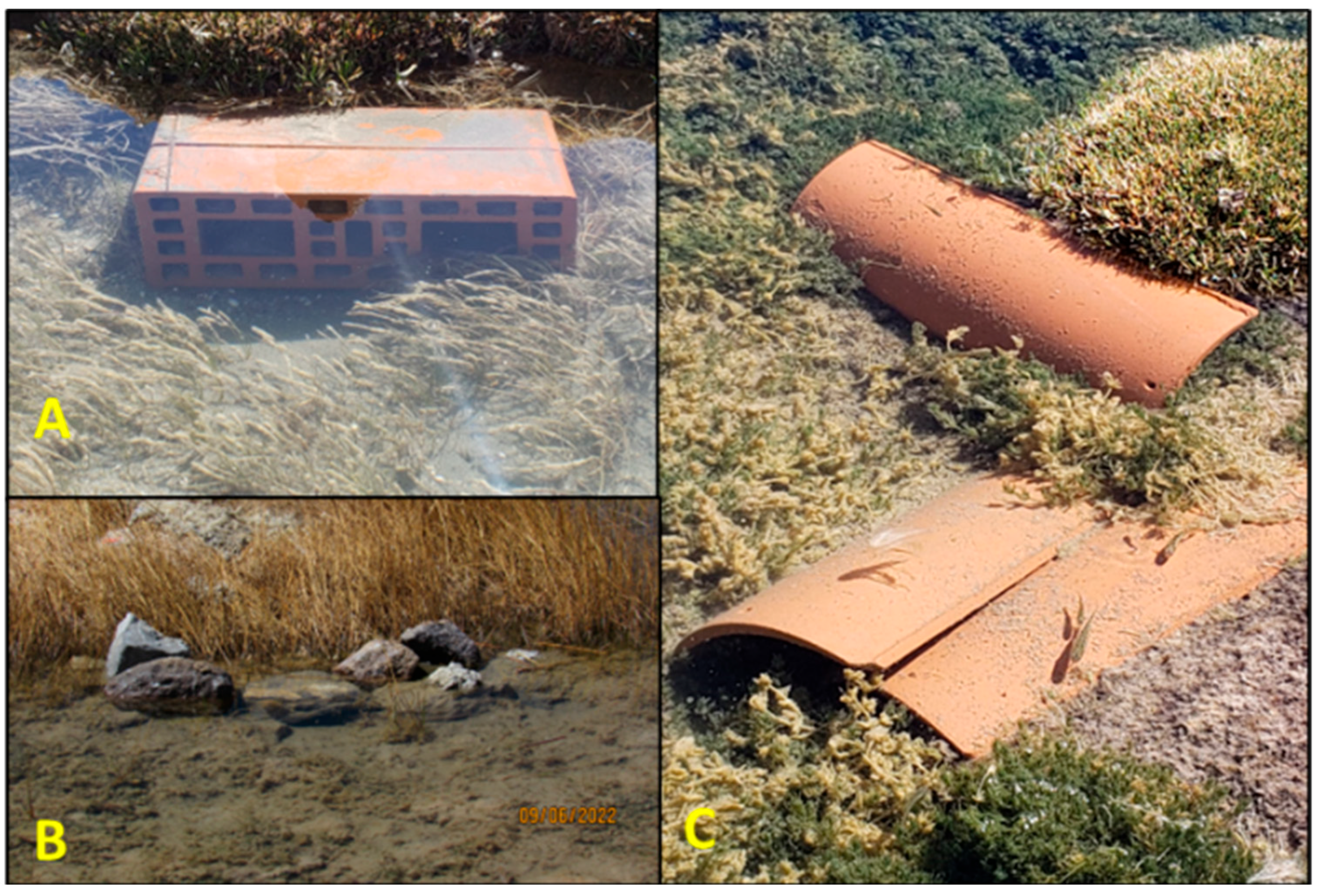 - Moring, J.R.; Nicholson, P.H. Evaluation of three types of artificial habitats for fishes in a freshwater pond in Maine, USA. Bull. Mar. Sci. 1994, 55, 1149–1159. [Google Scholar]