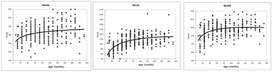 Several growth equations were tested (Gompertz, beta growth, exponential growth, logistic growth). The most adjusted model with the minimum of residues was the beta growth equation: Y = pr1 × (1 + (pr2 − X1)/(pr2 − pr3)) × (X1/pr2)exp(pr2/(pr2 − pr3)) where pr1, pr2, and pr3 are the parameters of the model and X1 the age of the camel (in months). This model was applied for each measurement (Figure 2 and Table 2).