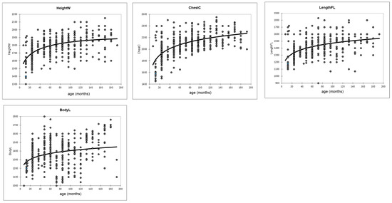 Growth curve of the body measurements in Bactrian camels according to the beta growth model.