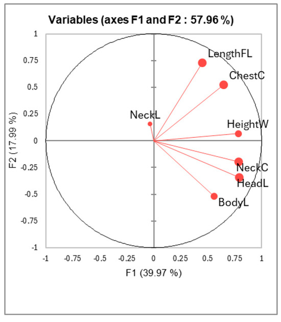 Correlations circle of the body measurements of the adult Bactrian camels on the two first factors of the PCA.