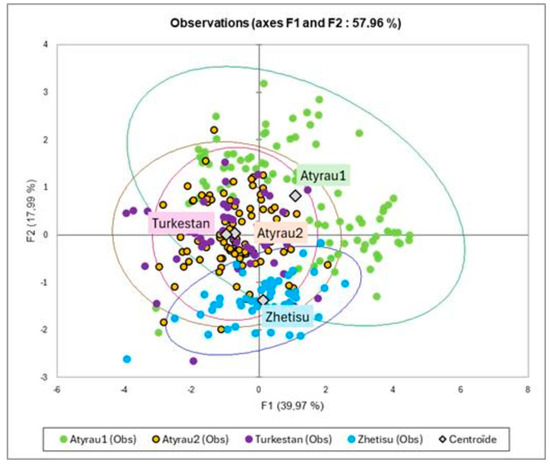 The correlations circle issued from PCA analysis has shown that all the parameters are correlated positively along the main factor, except LengthFL, which is correlated to the second factor, and NeckL, which is correlated to the third factor (Figure 3). The Bactrian camel from Atyrau1 had long legs, greater size, and a large chest, opposite to those from Zhetisu region, while there was a proximity between camels from Turkestan and Atyrau2, projected as close to the center of gravity of the main factorial plan (Figure 4). In these two farms, the Bactrian camels were characterized by their longer necks, while those from Zhetisu had longer heads, strong necks, and shorter legs.