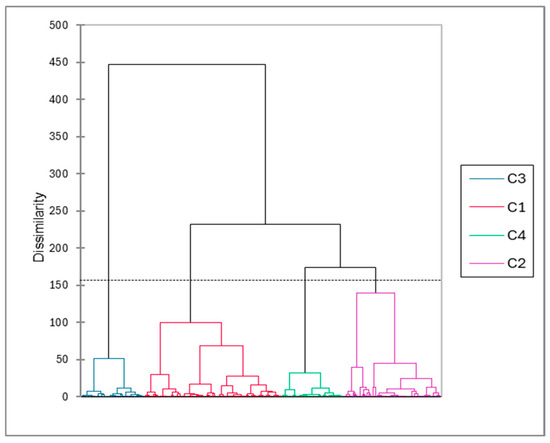 Dendrogram issued from the automatic classification (AHC) of the 278 adult Bactrian camels in Kazakhstan according to their body measurements. The four groups (namely C1 to C4) are represented by different colors.