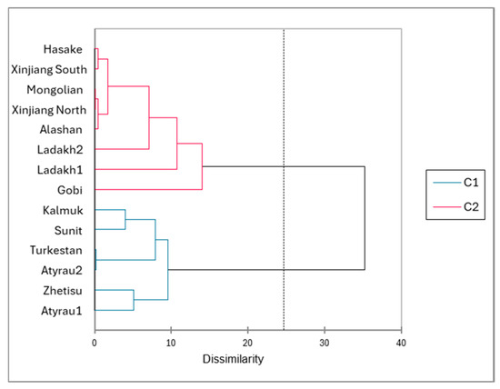 The comparison with other published results was limited as few references were available: one reference in China, including six breeds, two references in India regarding the Ladakh breed, one Mongolian reference, and one Russian reference only. The automatic classification applied to the table of the mean values of body measurements gave a clear distinction between the Bactrian from Kazakhstan, Russia, and the Sunit breed from China on one side (C1 in Figure 6), and the other breeds from China, Mongolia, and India on the other side (C2 in Figure 6)