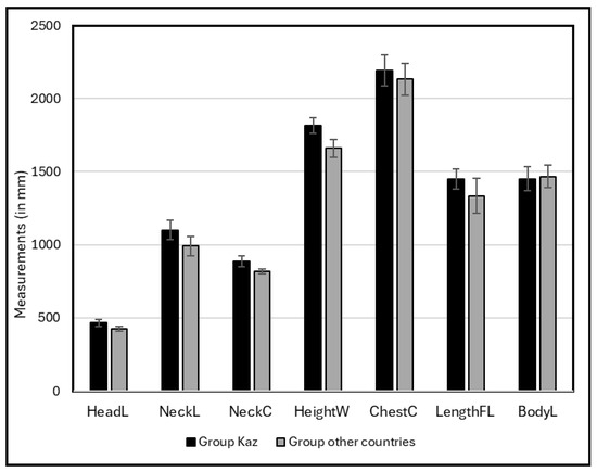 Values (mean and SD bars) of body measurements in Bactrian camels from Kazakhstan (group Kaz) and from other countries (group other countries).