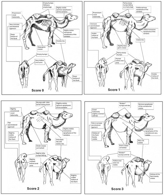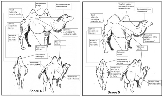 Regarding camel, the only BCS in dromedary (Camelus dromedarius) was published [23,24] and used in different publications in Australia [25] and in Spain [26]. To our knowledge, there was no equivalent for the Bactrian camel (Camelus bactrianus). Compared to the other farm animals, the large camelids have a specificity, leading to the impossibility of applying the classical grid used for bovine: the presence of one (dromedary) or two humps (Bactrian), where are concentrated the main part of the fat reserves [27]. Moreover, the behavior of the hump in case of important weight loss is different according to species: the hump of the dromedary is melting while the humps of the Bactrian are “falling”. In addition, the only slight appreciation of fat condition in the Bactrian camel, which was published, was based on the status of the hump observed backward [28]. In this reference, only 4 levels were described: (i) very fat camel with well-raised hump, (ii) medium fat camel with hump slightly leaning on the side, (iii) poor fat camel with hump leaning at 90°, and (iv) meagre camel with empty hump placed on the side of the body. However, such classification is not sufficient to describe the full condition status of the animal.