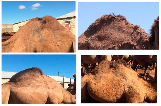 Indeed, if in China and Mongolia, only Bactrian camels are reared [52,53], in central Asia, the hybridization between dromedary and Bactrian camel is common [54], especially in Kazakhstan [55]. The fat reserve in the humps of the hybrids becomes more difficult to assess because a high variety in hump shape can be observed (Figure 11).