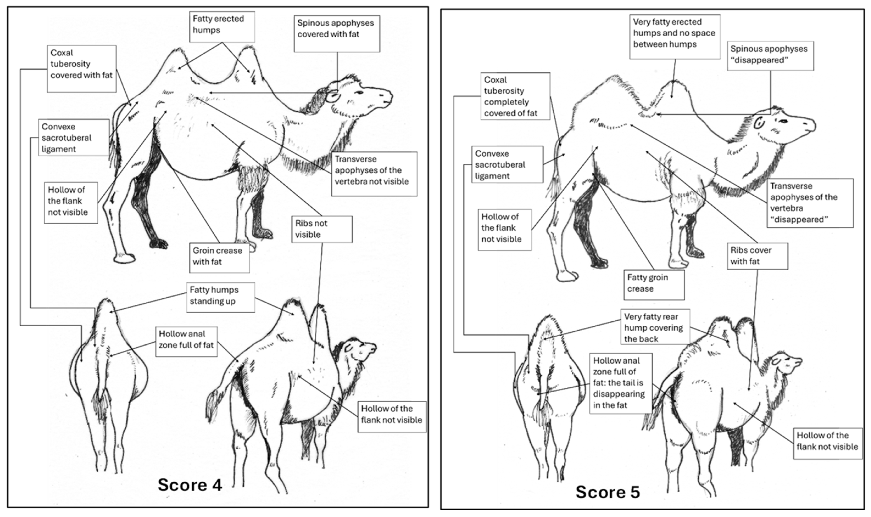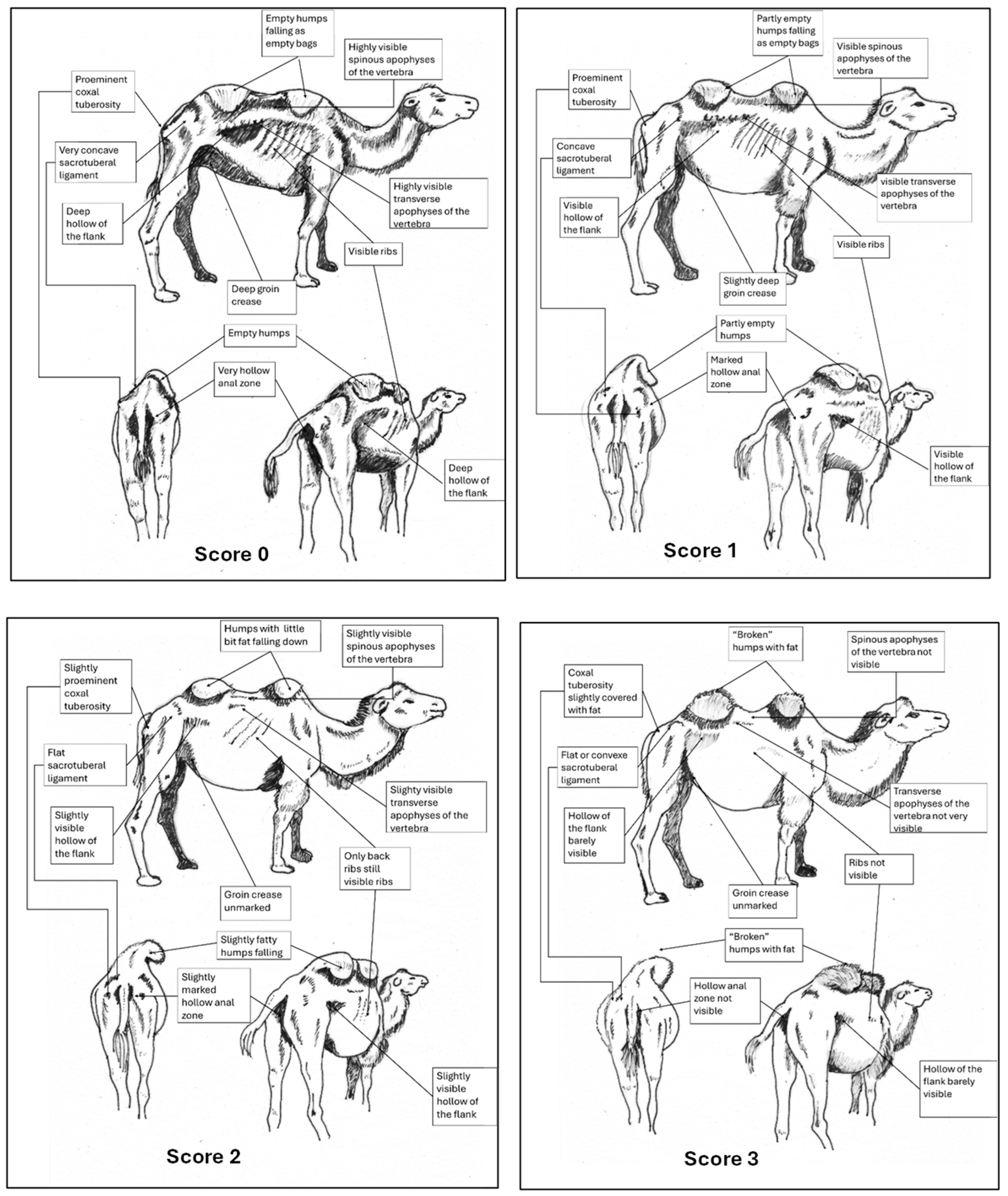 - Faye, B. Body Condition Score in Dromedary Camel; Technical leaflet; Camel project, Al-Kharj, project UTF/SAU/044/SAU; FAO: Riyadh, Saudi Arabia, 2013; pp. 1–12. (In Arabic) [Google Scholar]