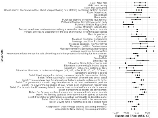 We estimated the effect of the messaging interventions compared to the control arm and to each other on support for legislation banning sale of all fur and fur from commercial farms (research question #3) both unadjusted and adjusted for covariates. We conducted adjusted analyses using targeted maximum likelihood estimation which allows for flexible covariate adjustment (i.e., allowing for interactions and non-linearity) with machine learning models. We included the following covariates in the models: all demographic variables as well as all the belief items related to fur and faux fur, behaviors (i.e., whether or not they have purchased fur or faux fur and likelihood of purchasing new or used fur), perceived acceptability of fur, and all the social norms questions. We also ran adjusted linear regression models as a sensitivity analysis and to examine the relative importance of different adjustment covariates on support for legislation (research question #4).