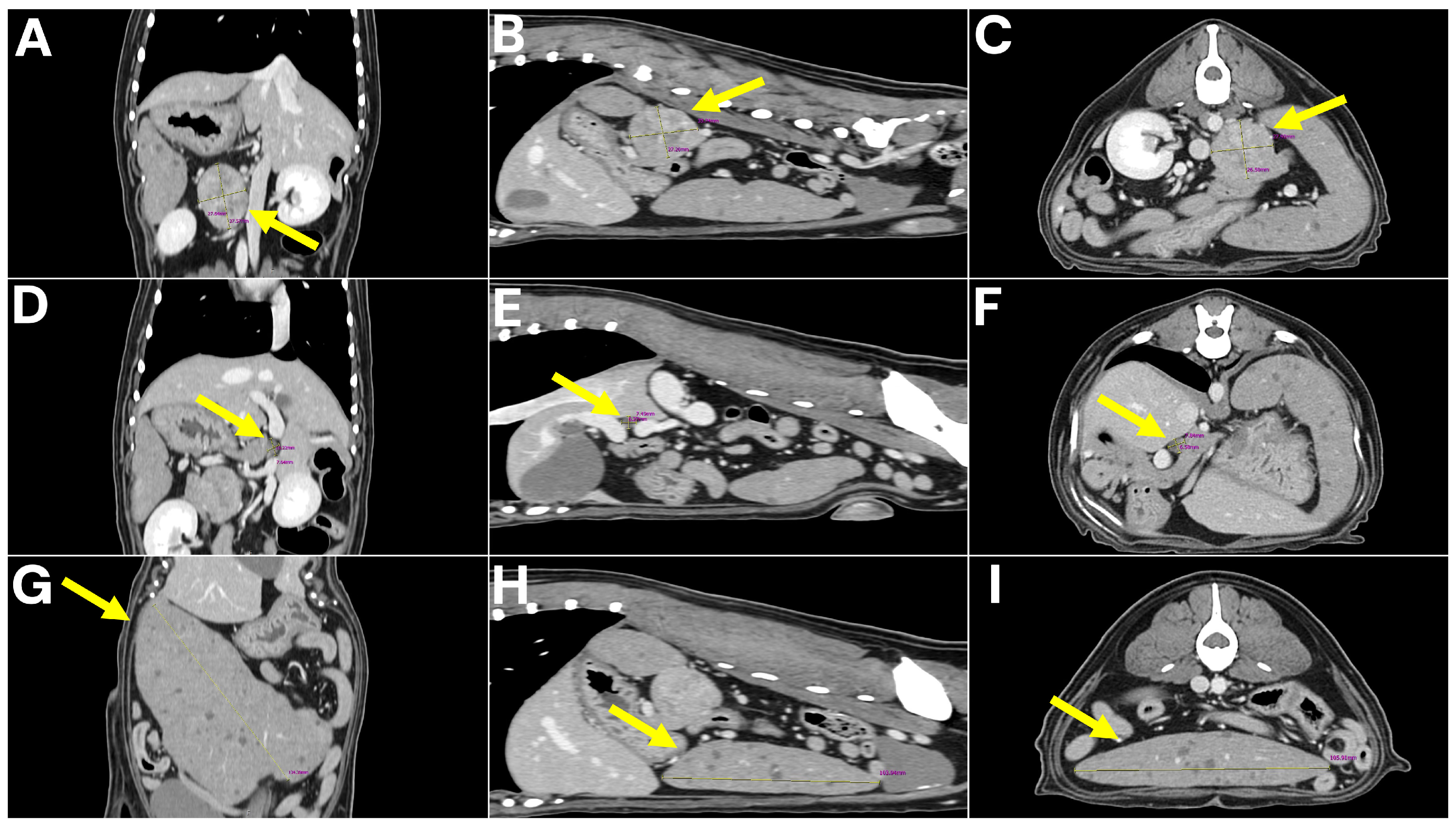 To further characterize the lesions and assess for metastatic disease, computed tomography (CT) was performed. No pulmonary metastasis was detected; however, multiple intra-abdominal masses with suspected metastatic lesions were observed. The retroperitoneal mass was delineated as a 4 × 3 × 3 cm lesion arising from the left adrenal gland, consistent with a tentative diagnosis of adrenal tumor. The spleen was enlarged and contained multiple nodular masses, while the mesenteric lymph nodes were markedly enlarged. In addition, a 7 mm lesion adherent to the wall of the hepatic portal vein (extraluminal mass) was detected and initially interpreted as a possible metastatic lesion (