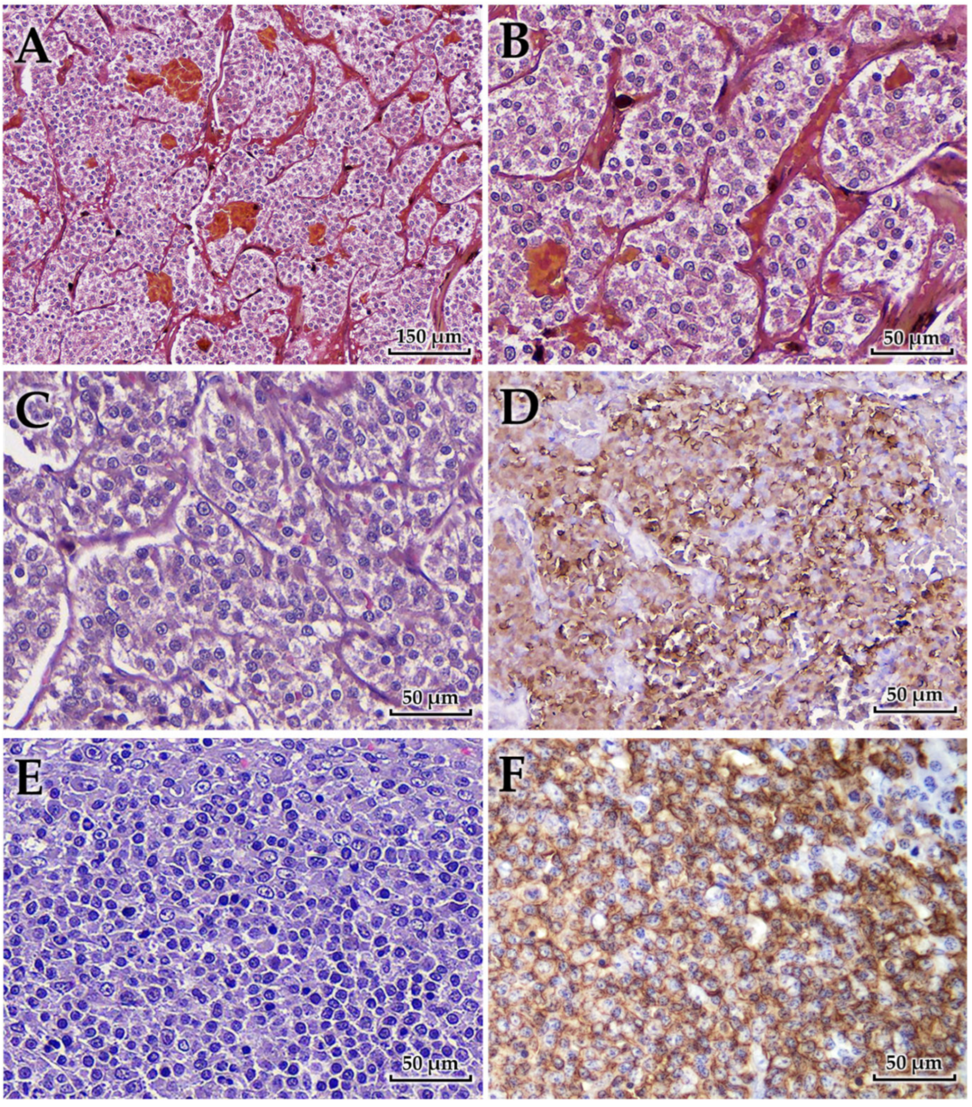 Figure 4). The adrenal tumor was composed of polyhedral to pleomorphic neoplastic cells with lightly eosinophilic, finely granular, and often indistinct cytoplasm. The cells were arranged in small lobules or nests along sinusoidal vessels, subdivided by fine fibrovascular septa and capillaries. Areas of coagulative necrosis and hemorrhage were observed throughout the lesions. Immunohistochemically, the neoplastic cells were strongly positive for chromogranin A but negative for cytokeratin and vimentin, consistent with a diagnosis of pheochromocytoma of medullary origin.