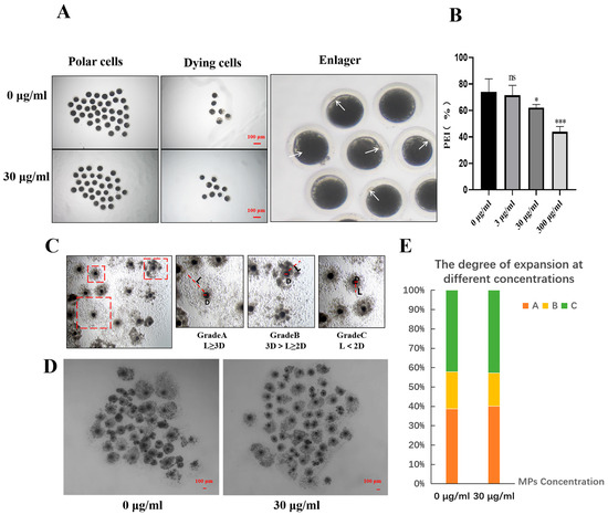 To investigate the effect of the environmental pollutant PS-MPs on the meiotic maturation of mammalian oocytes, different concentrations (3, 30, and 300 µg/mL) of PS-MPs were applied, and the morphology of porcine oocytes under a microscope was observed and statistically analyzed by SPSS and ImageJ, with a focus on PBE. As shown in Figure 2A, compared to the control group, the PS-MPs exposure led to varying results. After 46 h of IVM treatment, the meiotic maturation (M II stage) of porcine oocytes significantly decreased with higher PS-MPs concentrations: control group (74.11 ± 9.77%, n = 55 oocytes) vs. 3 µg/mL PS-MPs (74.27 ± 5.74%, ns, no significant difference, n = 50 oocytes), 30 µg/mL PS-MPs (59.43 ± 2.67%, p < 0.05, significant, n = 56 oocytes), and 300 µg/mL PS-MPs (43.89 ± 3.94%, p < 0.001, extremely significant, n = 56 oocytes), n = 3. These results indicate that PS-MPs hinder the meiotic maturation of porcine oocytes, suggesting PS-MPs as a potential cytotoxic substance for germ cells. Consequently, 30 µg/mL was selected as the appropriate concentration for subsequent experiments. Cumulus cells, which are closely linked to oocytes, transfer nutrients and signals through specialized spaces. The expansion of cumulus cells was observed and statistically analyzed to further evaluate the effect of PS-MPs on oocyte developmental ability. The expansion of COCs was visually assessed by quantifying the expansion degree of cumulus cells. The diameter of oocytes (denoted as D) and the diffusion diameter of cumulus cells (denoted as L) were measured. The relative dilation (L/D) of cumulus cells in the PS-MPs exposure and control groups was classified into three categories: grade A (complete dilation), grade B (partial dilation), and grade C (no dilation). As shown in Figure 2D, no significant difference in cumulus cell dilation was observed between the groups (0 µg/mL: Grade A dilation: X = 38.71%; B-level expansion X = 19.12%; C-level expansion: X = 42.17%; n = 3; 30 µg/mL: Grade A dilation: X = 40.05%; B-level expansion X = 17.21%; C-level expansion: X = 42.74%; n = 3).