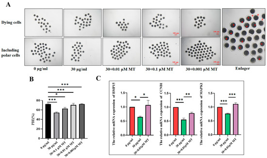 To verify whether MT can alleviate the developmental impairment of porcine oocyte maturation caused by PS-MPs, the early embryo rate was first assessed. Parthenogenetic activation of mature oocytes was performed for each group, and the blastocyst rate was observed. The results showed that the embryo rate of porcine oocytes exposed to PS-MPs was significantly lower than that of the control group. MT treatment improved the early embryo development in PS-MP-exposed oocytes (control: 33.33 ± 2.89%, n = 30 oocytes PS-MPs: 10.67 ± 0.57%, n = 33 oocytes, MT: 16.00 ± 1.7%, n = 38 oocytes, n = 3) (Figure 8A).